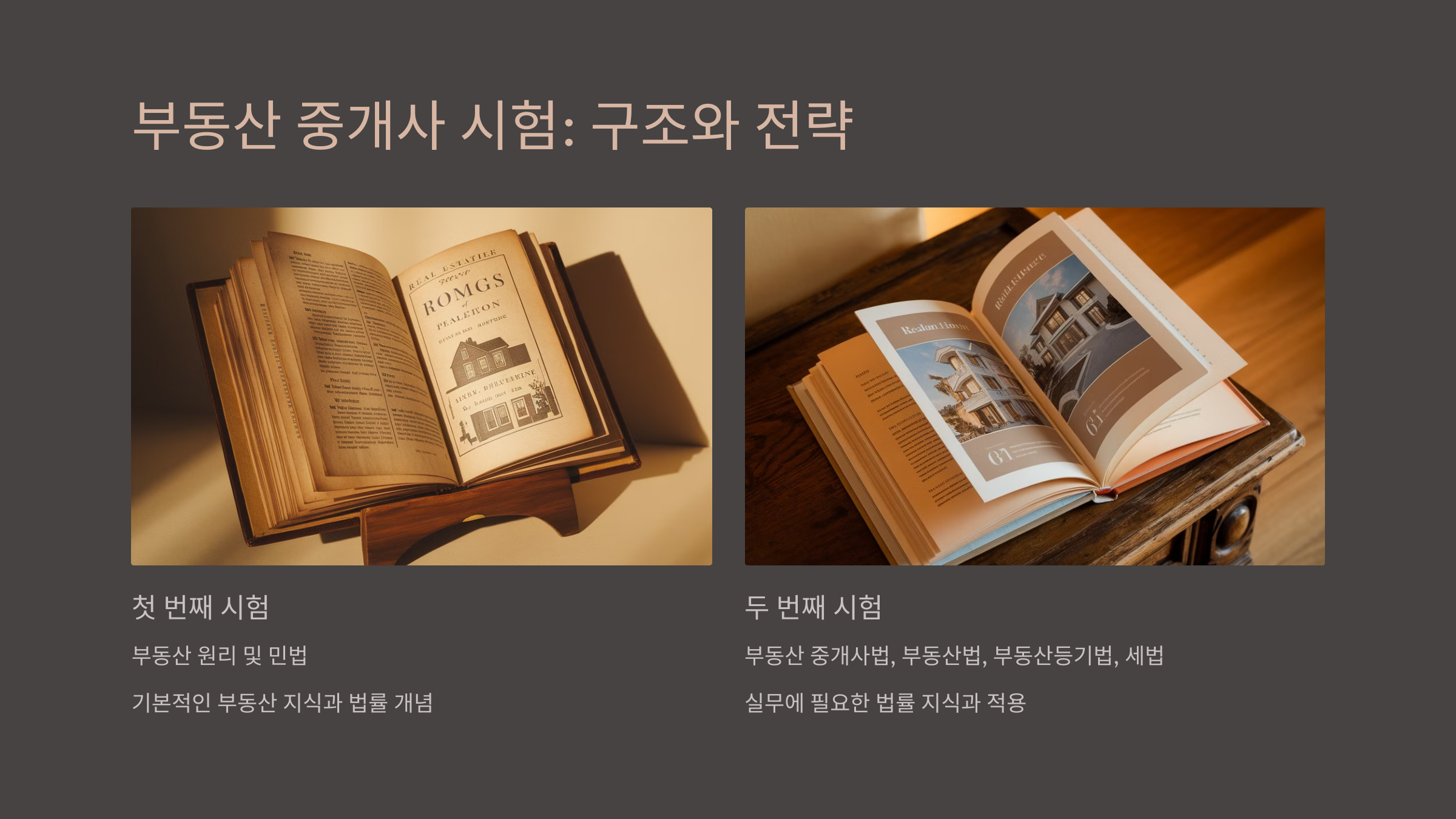 공인중개사 시험은 1차 시험과 2차 시험으로 나뉘며, 각 시험은 두 과목으로 구성되어 있습니다. 각 과목별로 적합한 학습 전략이 필요합니다.