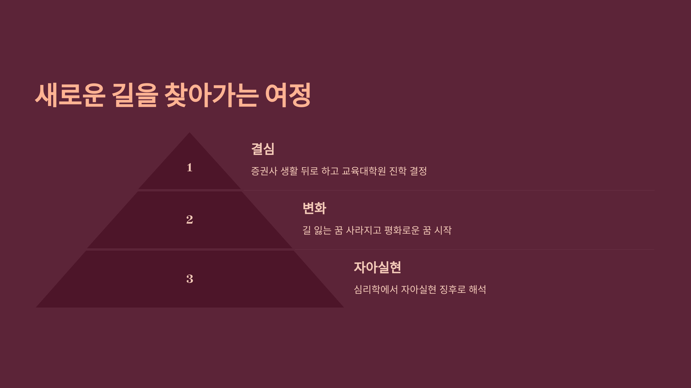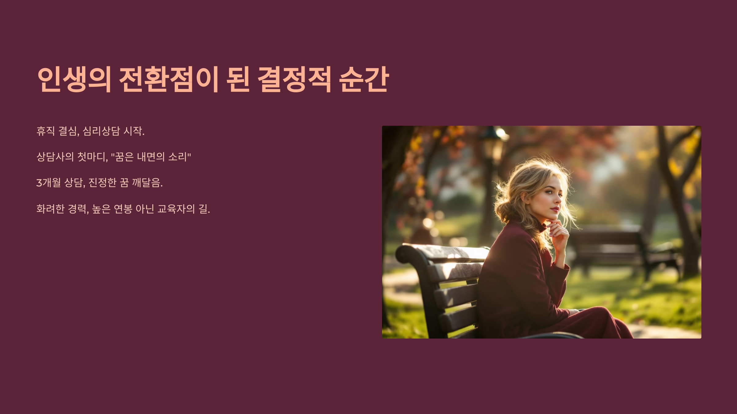 3개월간의 상담 과정에서 깨달았습니다. 제가 진정으로 원하는 것은 화려한 경력도, 높은 연봉도 아니었다는 것을. 어린 시절부터 꿈꿔왔던 교육자의 길을 포기하고, 남들이 말하는 '성공'을 쫓아 달려온 시간들이 떠올랐습니다.
