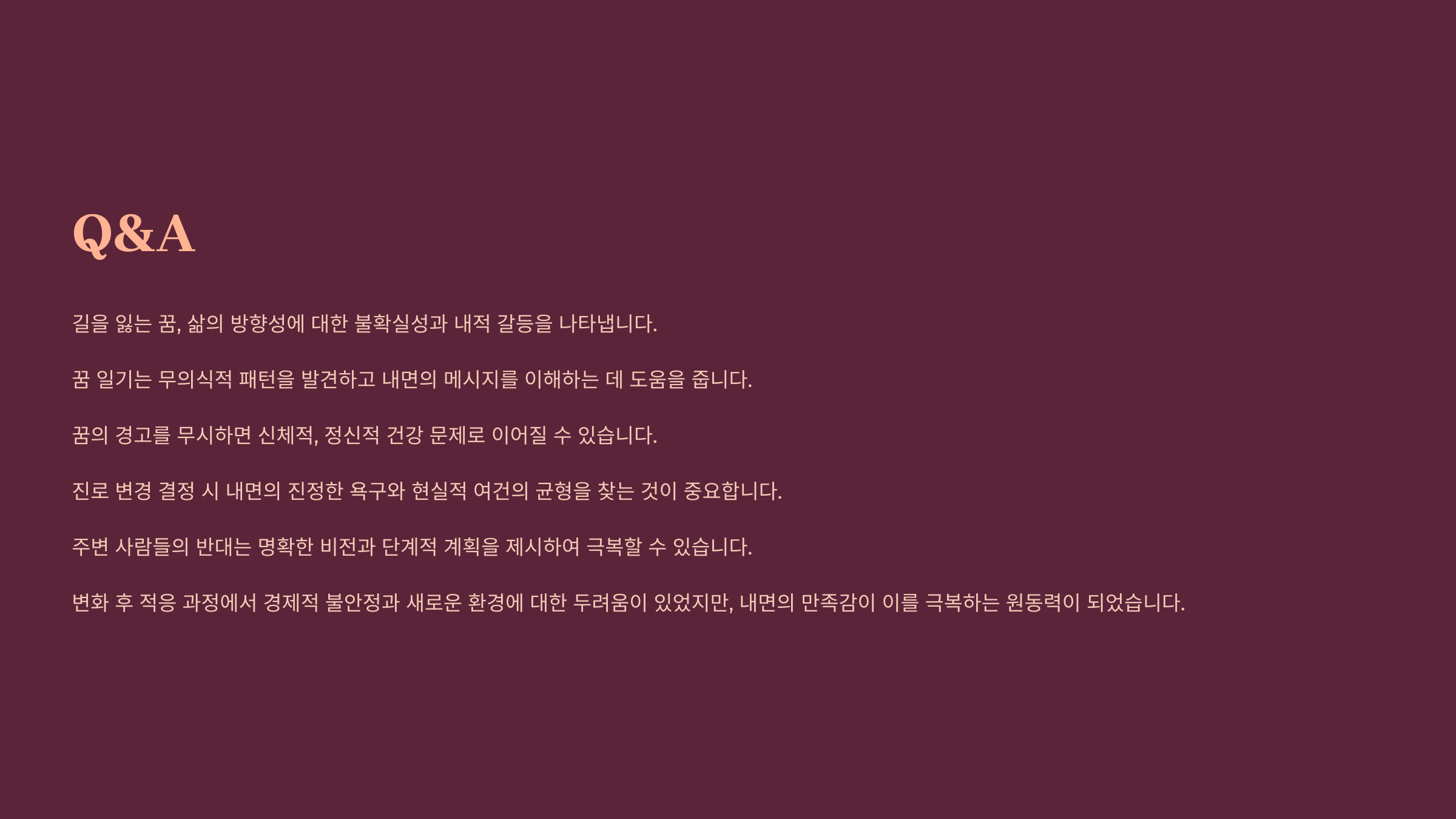 놀랍게도, 결정을 내린 그날부터 길을 잃는 꿈은 사라졌습니다. 대신 넓은 들판을 걷는 평화로운 꿈을 꾸기 시작했죠. 심리학에서는 이를 '자아실현의 징후'라고 부른다고 합니다.