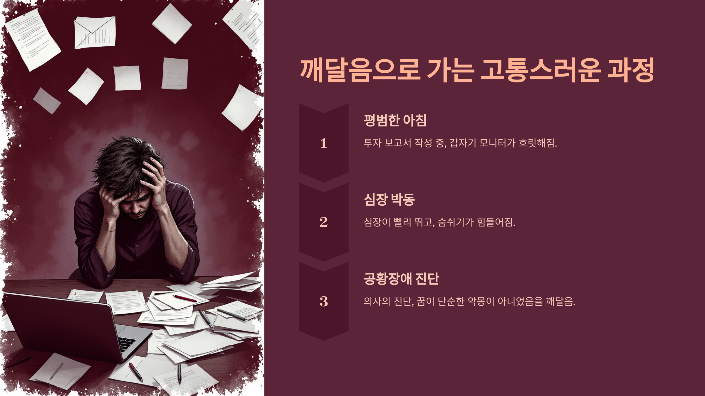 그날은 평소와 다름없는 아침이었습니다. 중요한 투자보고서를 작성하던 중, 갑자기 모니터가 흐릿해지기 시작했습니다. 심장이 빠르게 뛰었고, 숨쉬기가 힘들어졌죠. 공황장애 진단을 받은 것은 그날 오후였습니다.