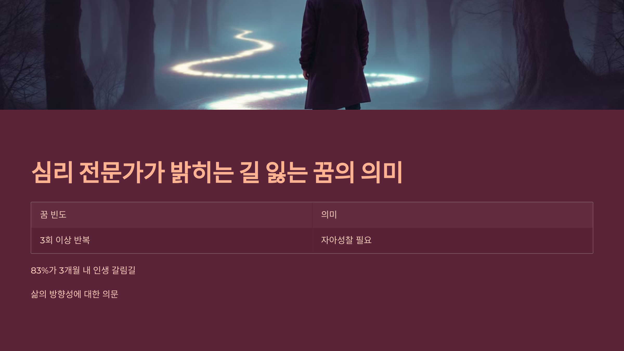 국제꿈연구소의 최근 연구 결과(2023)에 따르면, 길을 잃는 꿈을 꾸는 사람의 83%가 3개월 내에 중요한 인생의 갈림길에 서게 된다고 합니다.