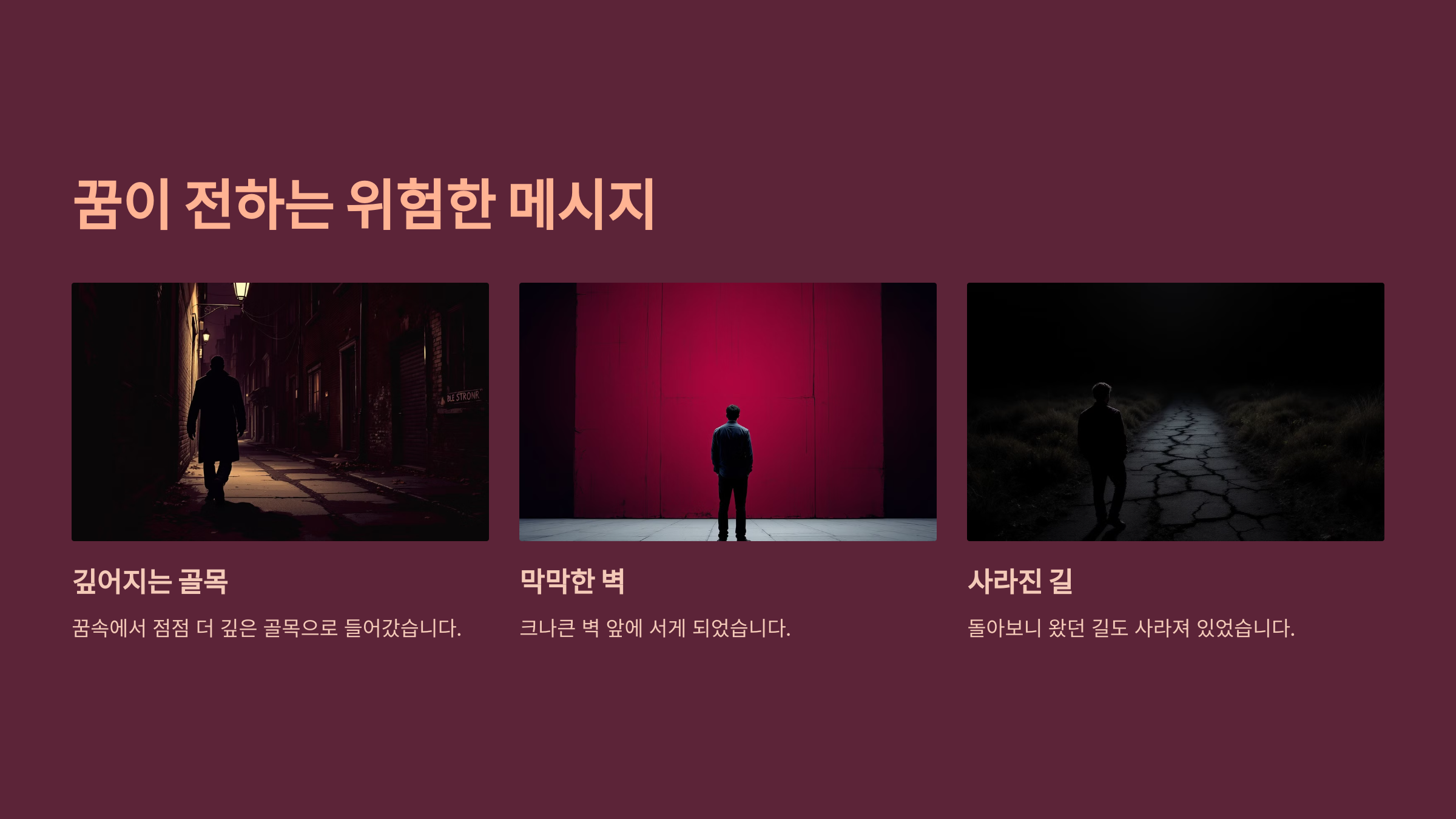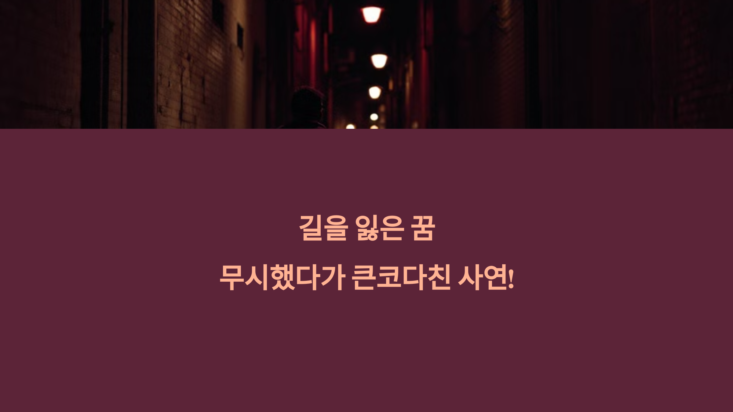 꿈속에서 저는 점점 더 깊은 골목으로 들어갔고, 주변은 점점 더 어두워졌습니다. 그리고 마침내 크나큰 벽 앞에 서게 되었죠. 돌아보니 왔던 길도 사라져 있었습니다. 바로 그때, 현실에서도 제 인생의 벽을 마주하게 되었습니다.