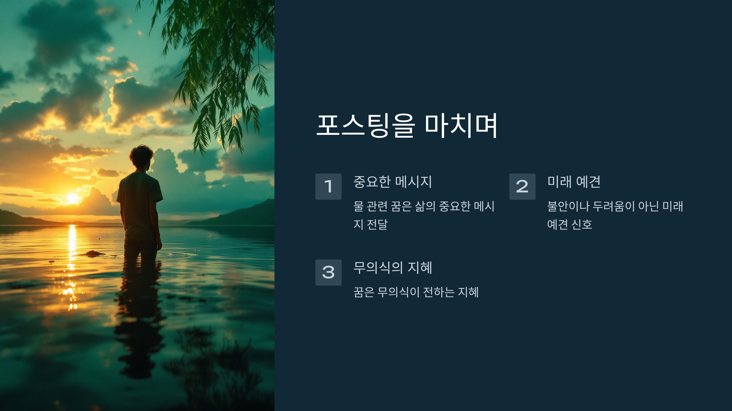 하지만 놀랍게도 이 꿈 이후 제 삶에 예상치 못한 변화가 찾아왔고, 이를 계기로 물과 관련된 다양한 꿈의 의미를 깊이 연구하게 되었습니다.