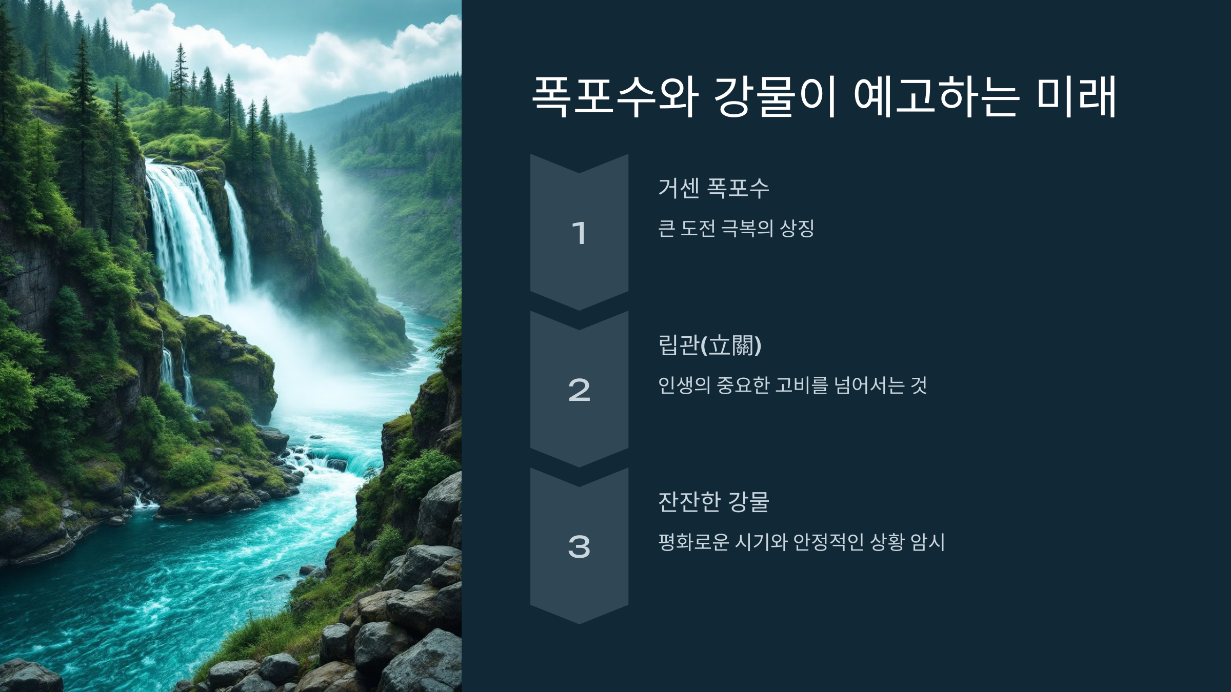 폭포수나 강물과 관련된 꿈은 또 다른 차원의 메시지를 담고 있습니다. 제 경험에서는 거센 폭포수를 올라가는 꿈을 꾼 후, 큰 도전을 성공적으로 극복한 적이 있습니다.
