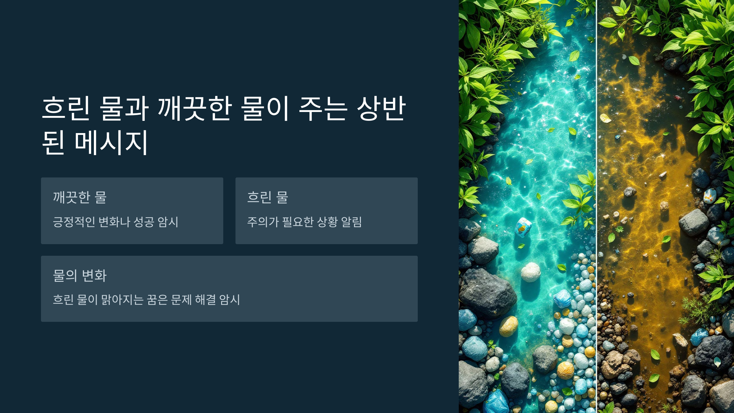 맑은 물은 대부분 긍정적인 변화나 성공을 암시했고, 흐린 물은 주의가 필요한 상황을 알려주는 신호였습니다.