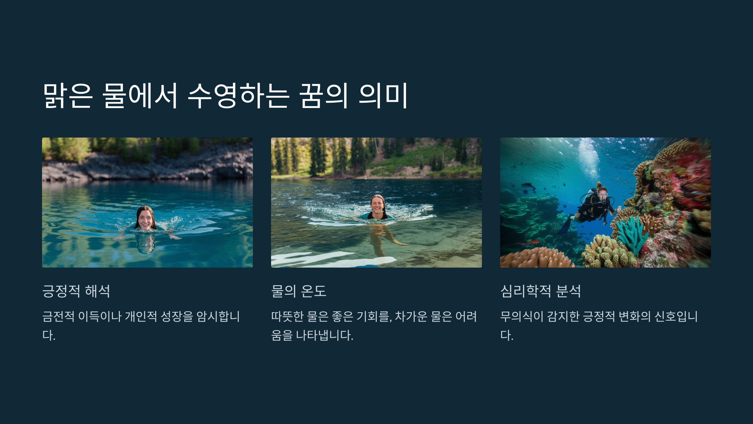 처음에는 너무나 두려웠지만, 신기하게도 그 물속은 편안하고 따뜻했죠. 잠에서 깨어난 후 찾아본 해몽 정보들은 제각각 달랐고, 이것이 과연 길몽일지 흉몽일지 혼란스러웠습니다.