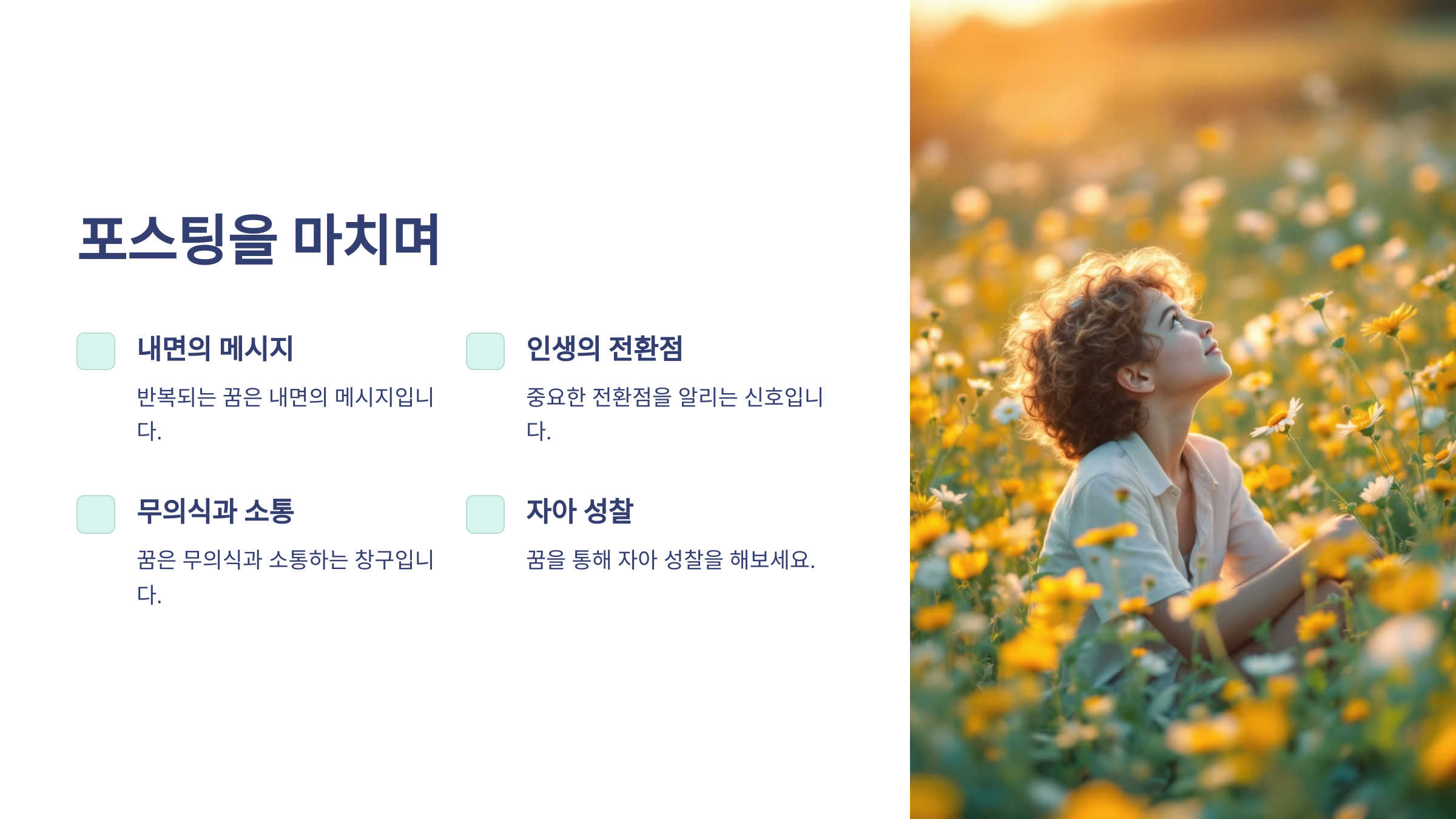 때로는 우리가 미처 깨닫지 못한 내면의 목소리가 꿈을 통해 전달될 수 있으니까요. 이 글이 여러분의 꿈 이해와 자아 성찰에 도움이 되었기를 바랍니다.