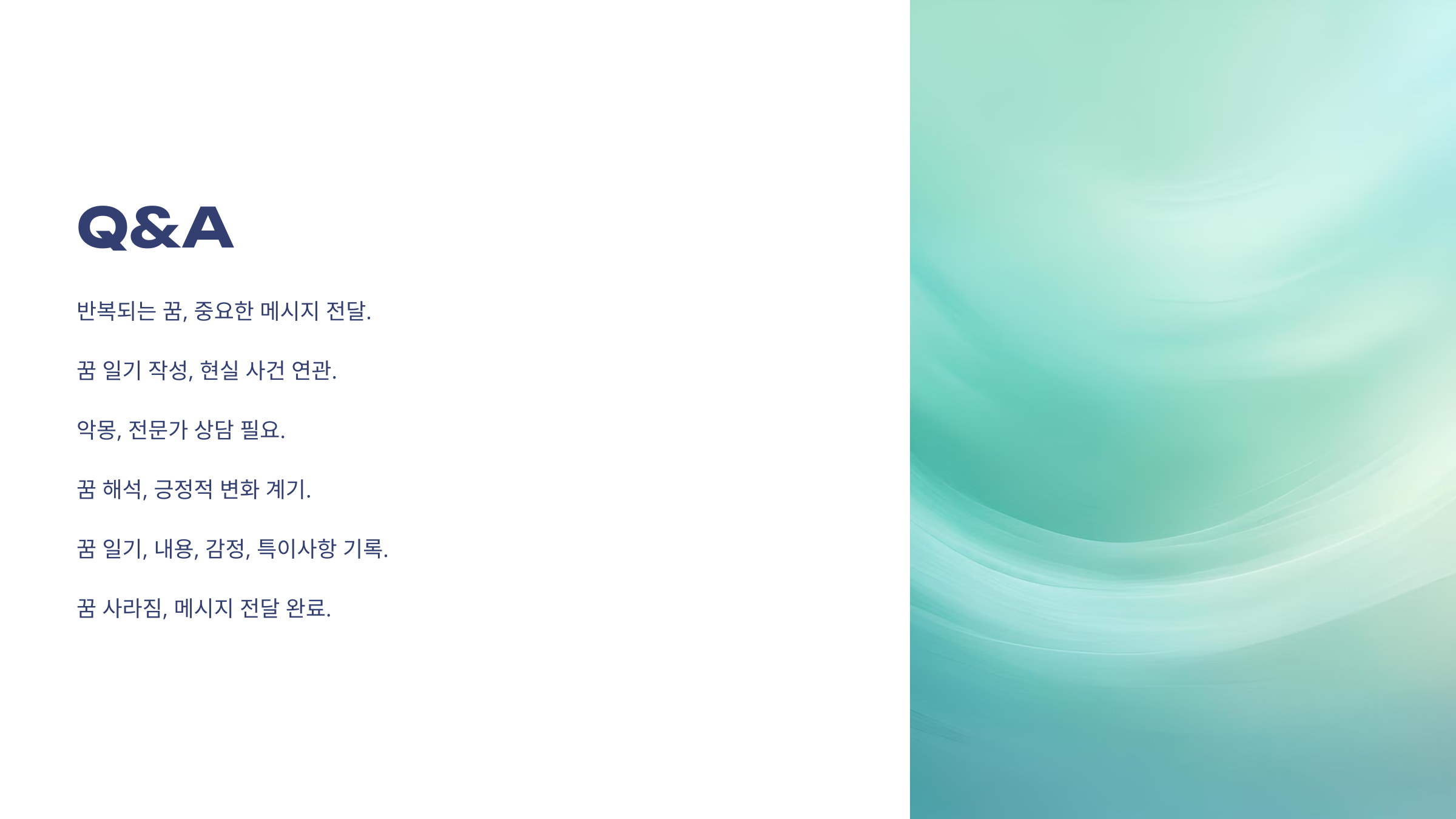 앞으로도 여러분의 꿈에 담긴 메시지에 귀 기울이고, 그 속에서 발견하는 인사이트를 삶에 적용해보시기를 권장드립니다.