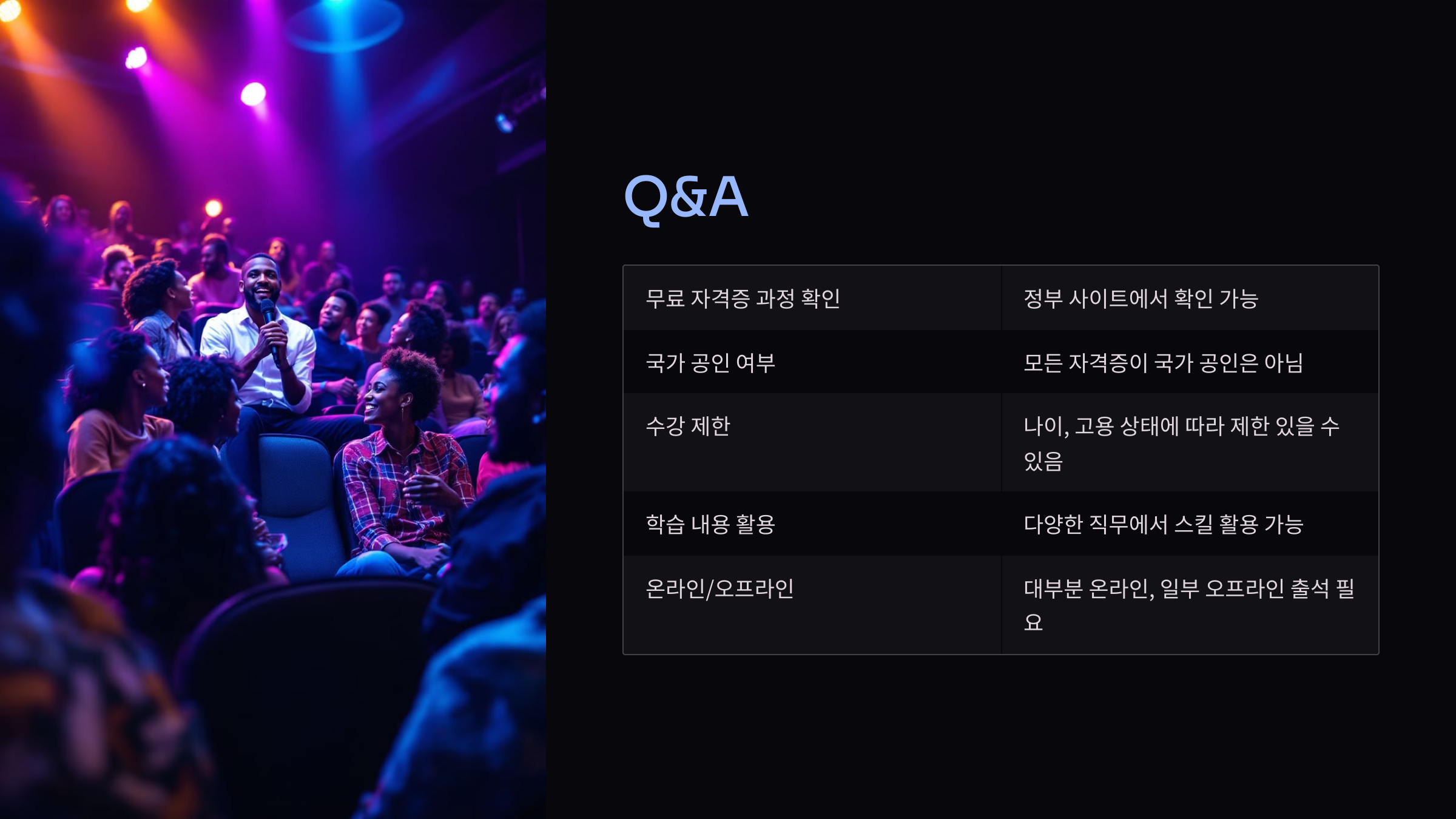 무료 자격증 과정은 실력을 쌓고 직무 능력을 강화할 수 있는 절호의 기회예요. 무료로 제공되는 과정이라도 유용한 자격증이 많으니 적극적으로 활용해 보세요. 새로운 직무에 도전하거나 스킬을 강화하는 데 이 무료 과정들이 큰 도움이 될 거예요. 관심 있는 분야가 있다면 오늘부터 도전해 보세요!