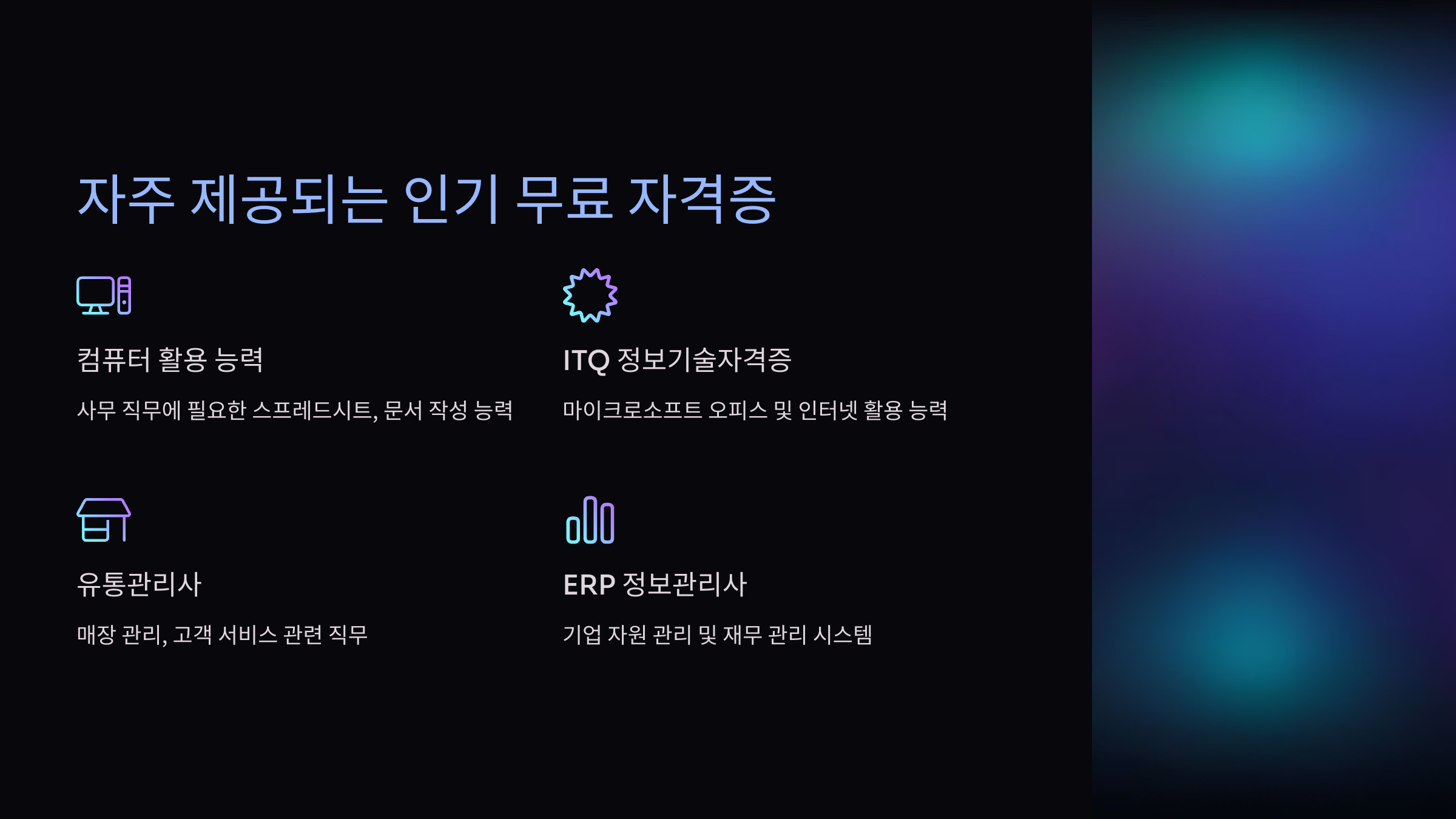 무료 자격증 과정은 실무에 바로 활용 가능한 자격증이 많아 인기가 높아요. 다음은 자주 제공되는 인기 자격증입니다.