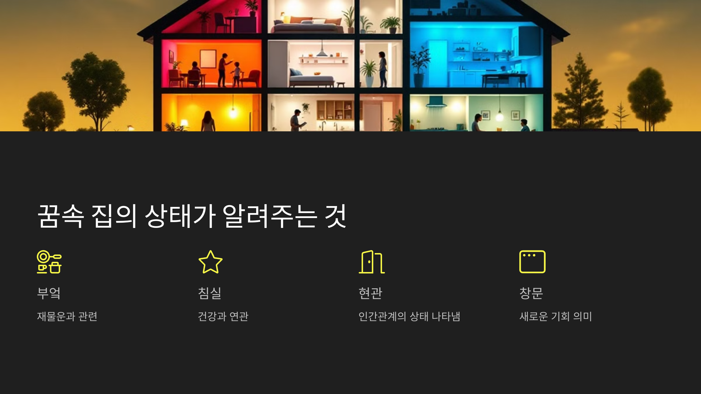 꿈에서 보는 집의 구체적인 상태는 매우 중요한 메시지를 담고 있습니다. 제 경험상, 집의 각 부분은 우리 삶의 다른 측면을 상징합니다.