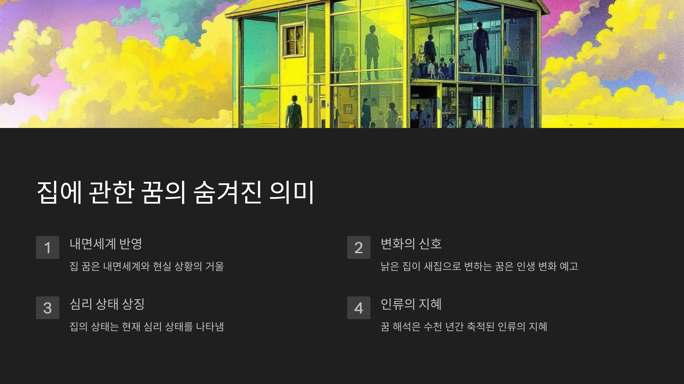 이는 단순한 우연이 아니었죠. 집에 관한 꿈은 우리 삶의 여러 측면에서 일어날 변화를 미리 알려주는 신호탄인 것입니다.