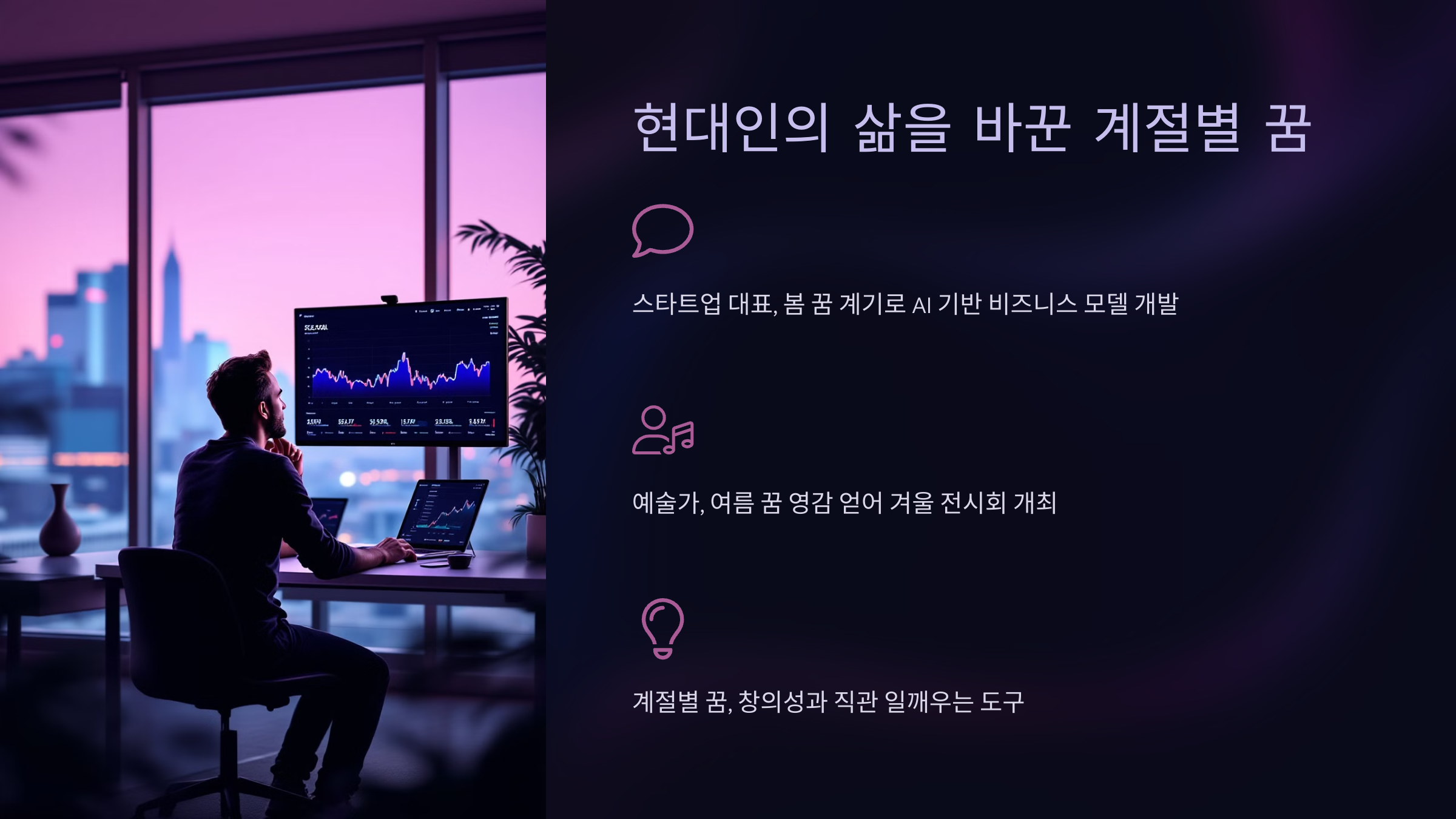 실제 사례를 살펴보면 더욱 흥미롭습니다. 한 스타트업 대표는 봄에 본 눈 내리는 꿈을 계기로, 가을에 AI 기반 계절성 비즈니스 모델을 개발해 큰 성공을 거두었습니다.
