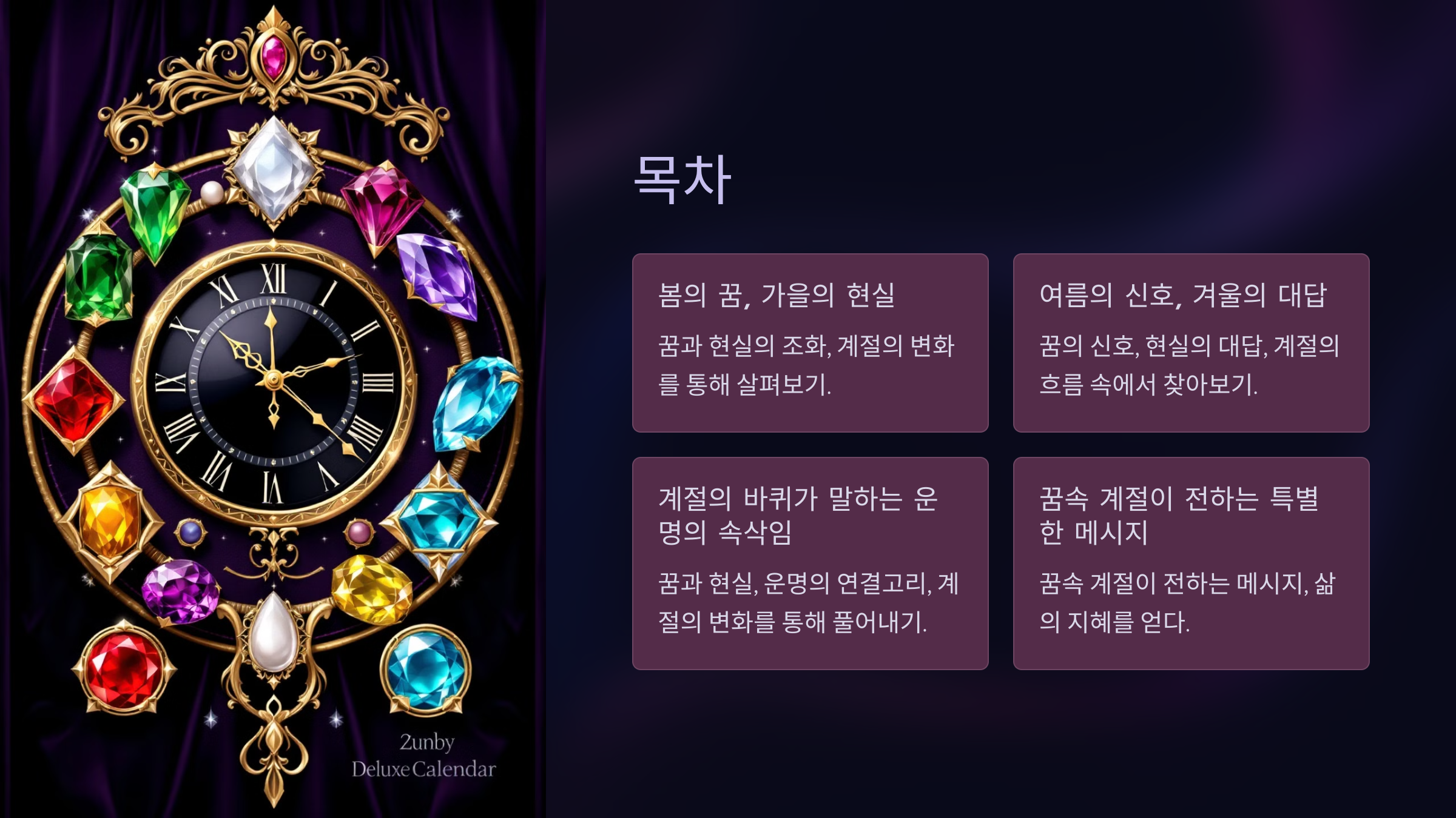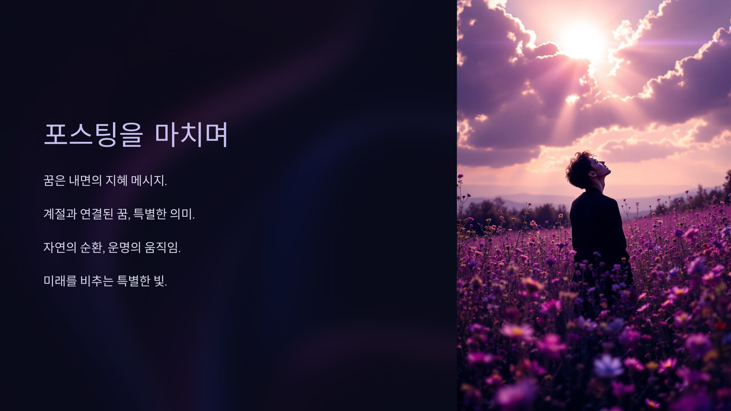 이제 우리는 꿈을 단순한 무의식의 산물이 아닌, 미래를 준비하는 내면의 나침반으로 바라볼 필요가 있습니다. 특히 계절의 변화와 함께 찾아오는 꿈들에 더욱 주의를 기울여야 할 때입니다.