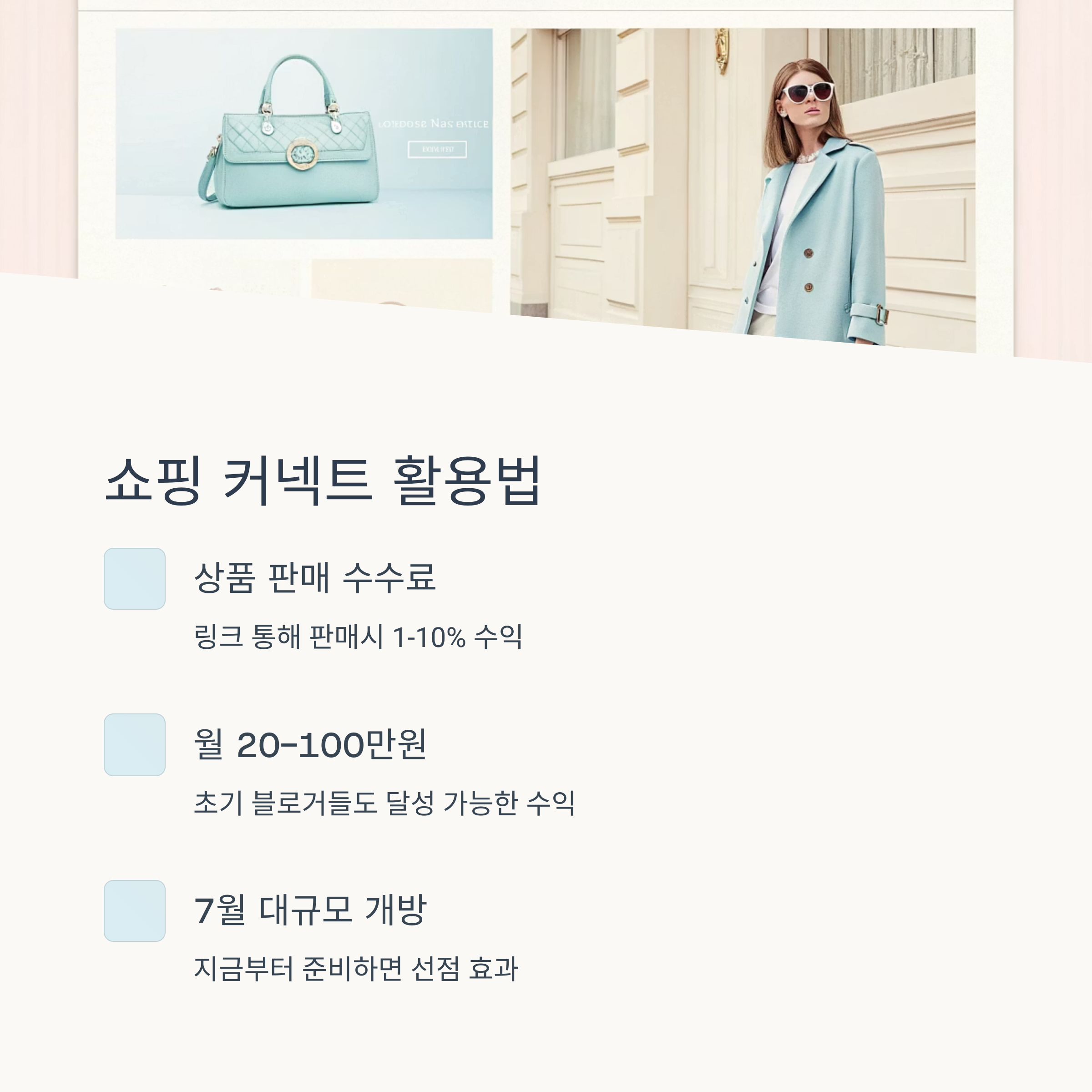 쇼핑 커넥트는 네이버가 최근 새롭게 도입한 수익화 시스템이에요. 쉽게 말해 네이버판 ‘어필리에이트 마케팅’으로, 블로그에 특정 상품 링크를 걸고 그 링크를 통해 상품이 판매되면 일정 수수료를 받을 수 있는 구조예요. 현재는 일부 사용자에 한해 오픈되었지만, 7월부터는 대규모로 개방될 예정이에요.