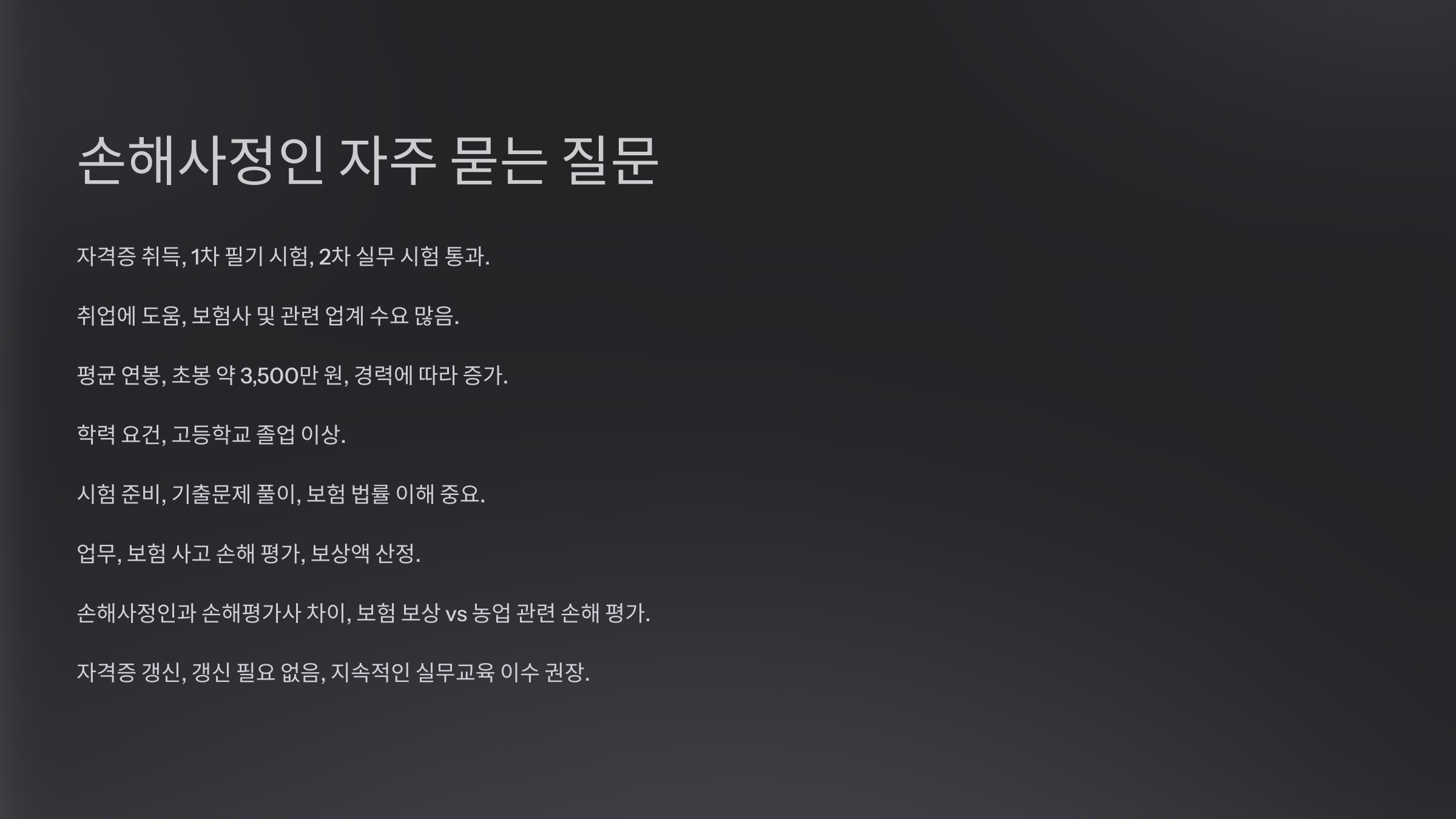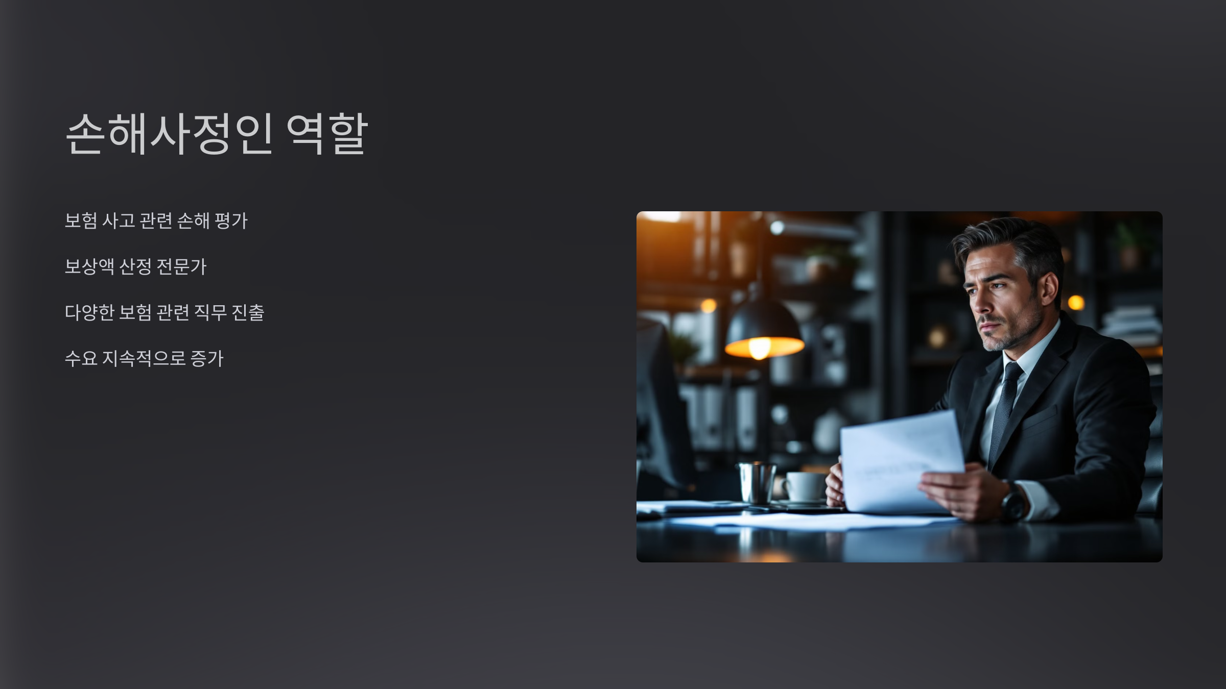 손해사정인은 보험 사고와 관련된 손해를 평가하고 보상액을 산정하는 전문가입니다. 손해사정인 자격증을 통해 다양한 보험 관련 직무에 진출할 수 있어, 수요가 지속적으로 증가하고 있습니다.