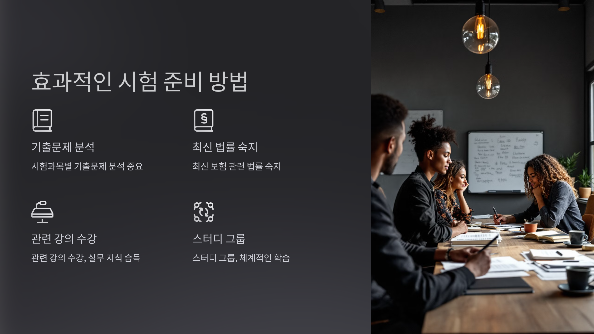 또한, 시험 전에는 손해사정 실무와 관련한 연수나 교육을 이수하는 것이 권장됩니다.