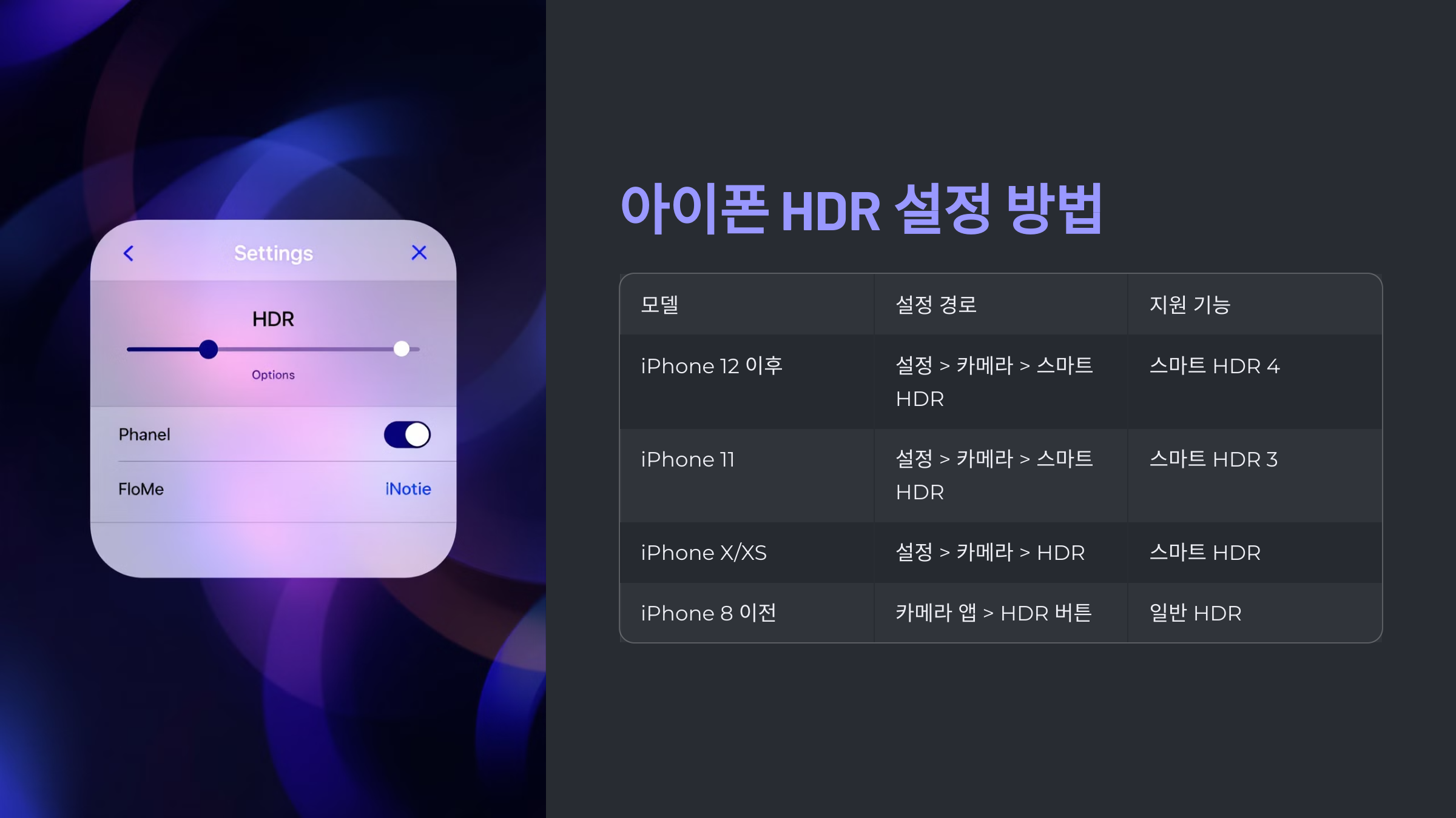이 표를 통해 각 모델별 특징과 설정 방법을 한눈에 파악할 수 있습니다. 저는 아이폰 12를 사용하면서 스마트 HDR의 편리함을 직접 경험했는데요, 자동으로 최적화되는 기능이 정말 유용했습니다.