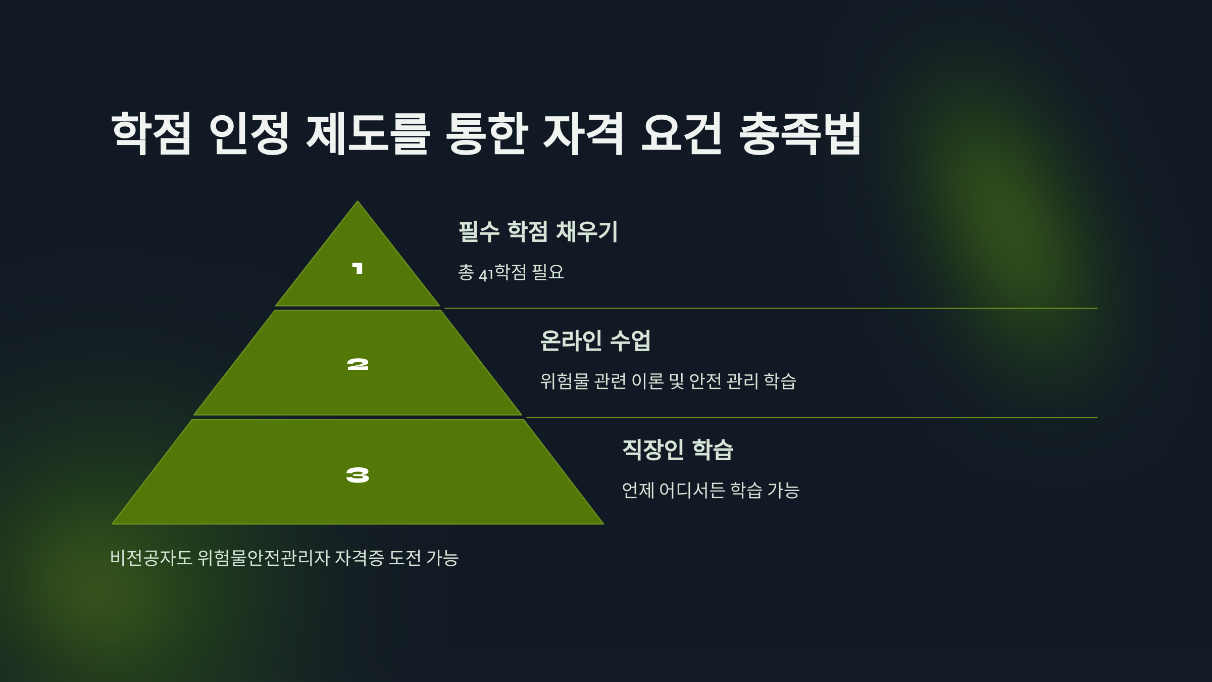 이와 같이 학점 인정 제도를 활용해 자격 요건을 충족하면 비전공자나 경력 없는 사람도 위험물안전관리자 자격증에 도전할 수 있습니다. 특히 고졸자나 다른 분야의 전공자라면 이 방법이 최선이에요.