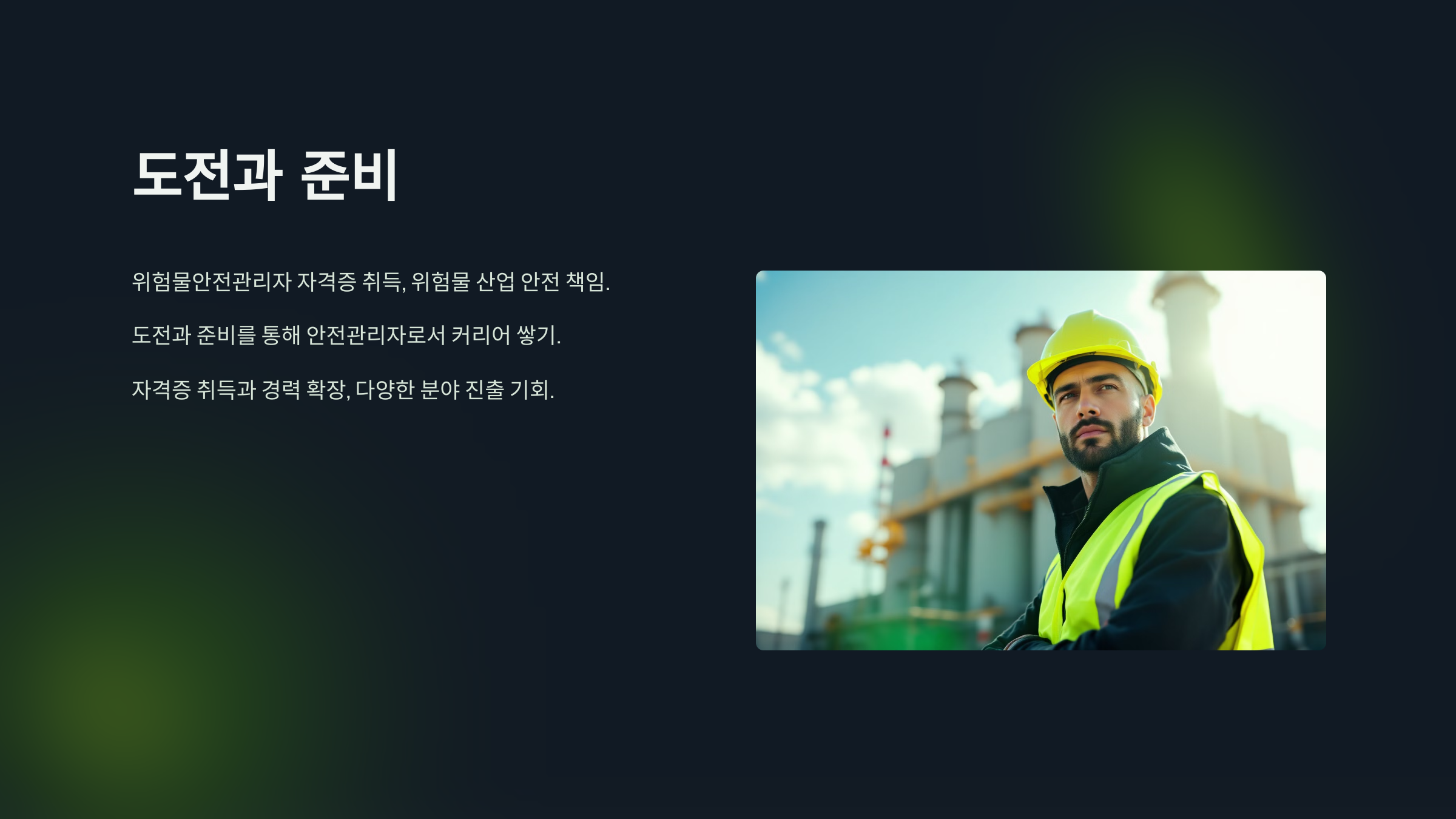 위험물안전관리자 자격증 취득을 통해 위험물 산업 분야의 안전을 책임지는 관리자가 될 수 있습니다. 도전과 준비를 통해 안전관리자로서 커리어를 쌓아가 보세요.