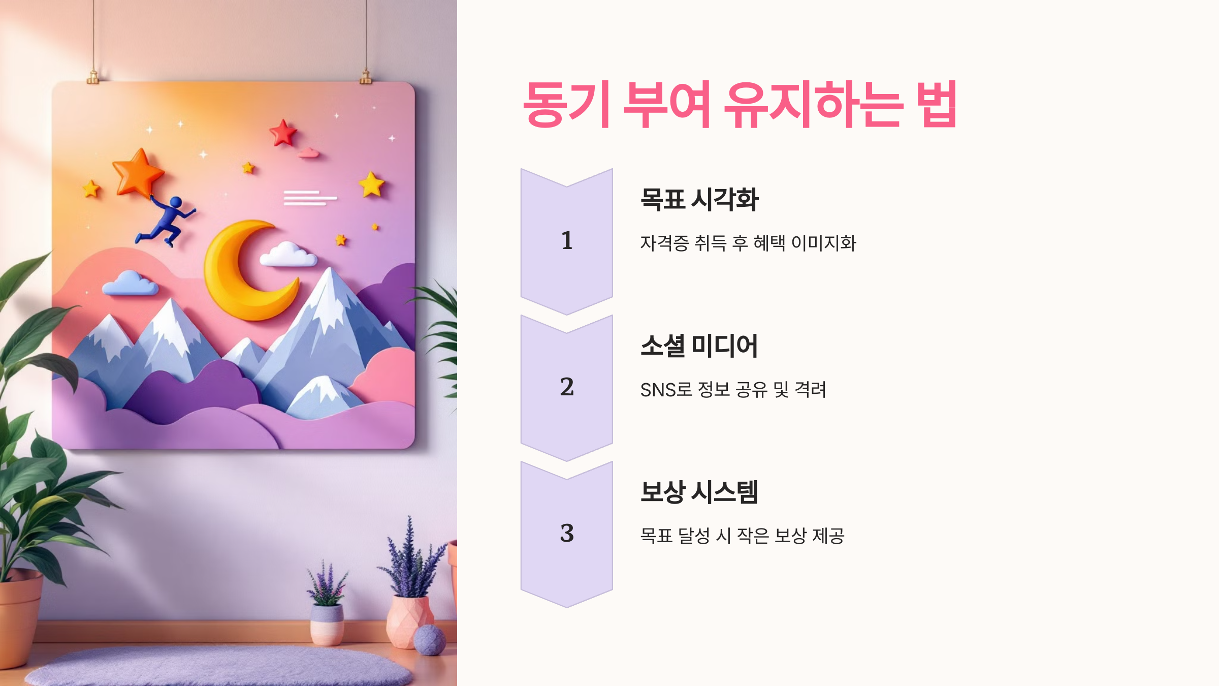 - 목표 시각화: 자격증 취득 후 얻을 수 있는 혜택이나 목표를 글로 적어두거나 이미지로 만들어 눈에 보이는 곳에 붙여두세요. 동기부여가 떨어질 때마다 목표를 떠올리며 동기를 다시 다질 수 있어요.