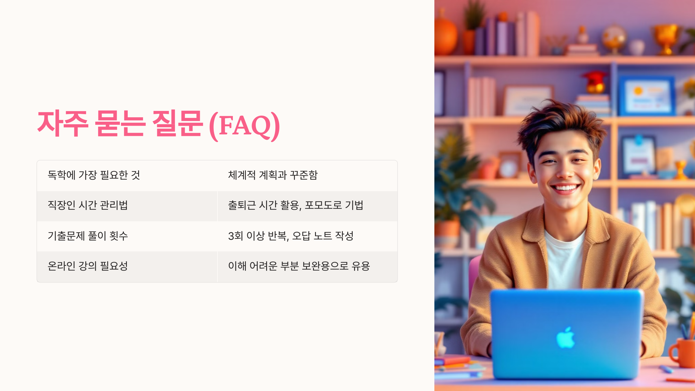 A2. 직장인이라면 출퇴근 시간을 활용해 온라인 강의를 듣거나, 잠자기 전 1시간을 집중 학습 시간으로 활용하는 방법이 좋아요. 포모도로 기법으로 짧고 집중적으로 공부하는 것도 효과적이에요.