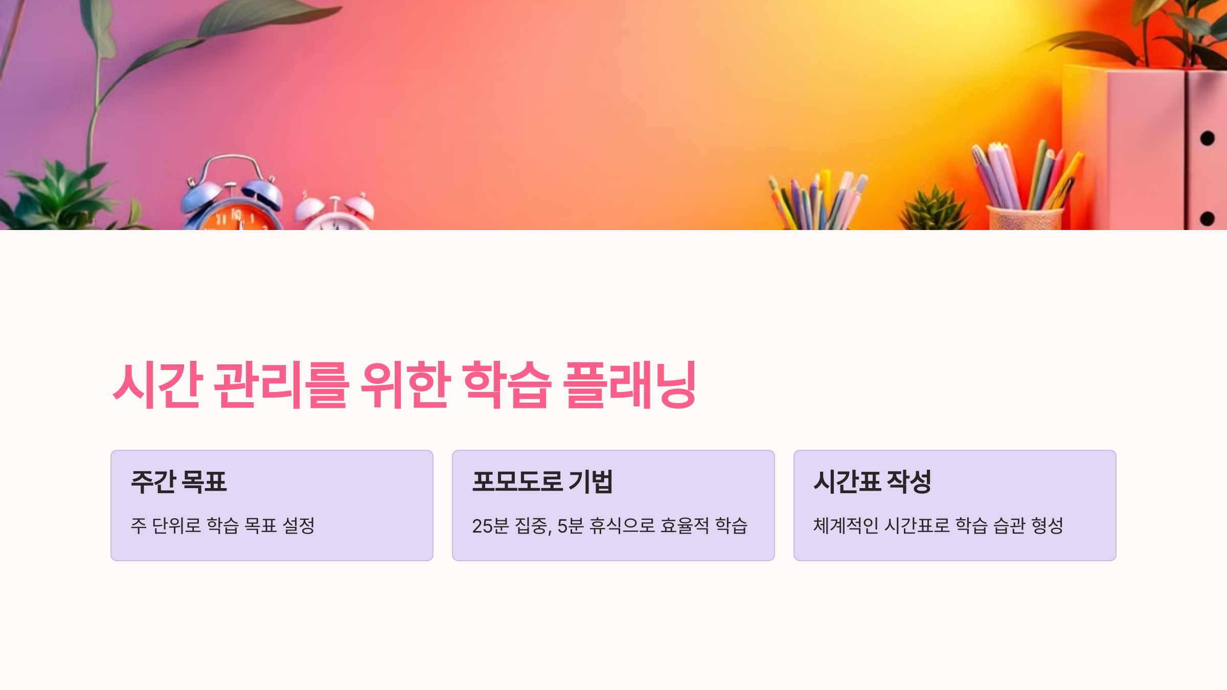시간 관리가 어려운 현대인들을 위해 효과적인 학습 플래닝은 자격증 독학의 필수입니다. 특히 직장인이나 학생이라면 하루에 적어도 1-2시간은 공부에 투자해야 하는데요. 시간을 효율적으로 관리하는 플래닝 방법을 소개합니다.