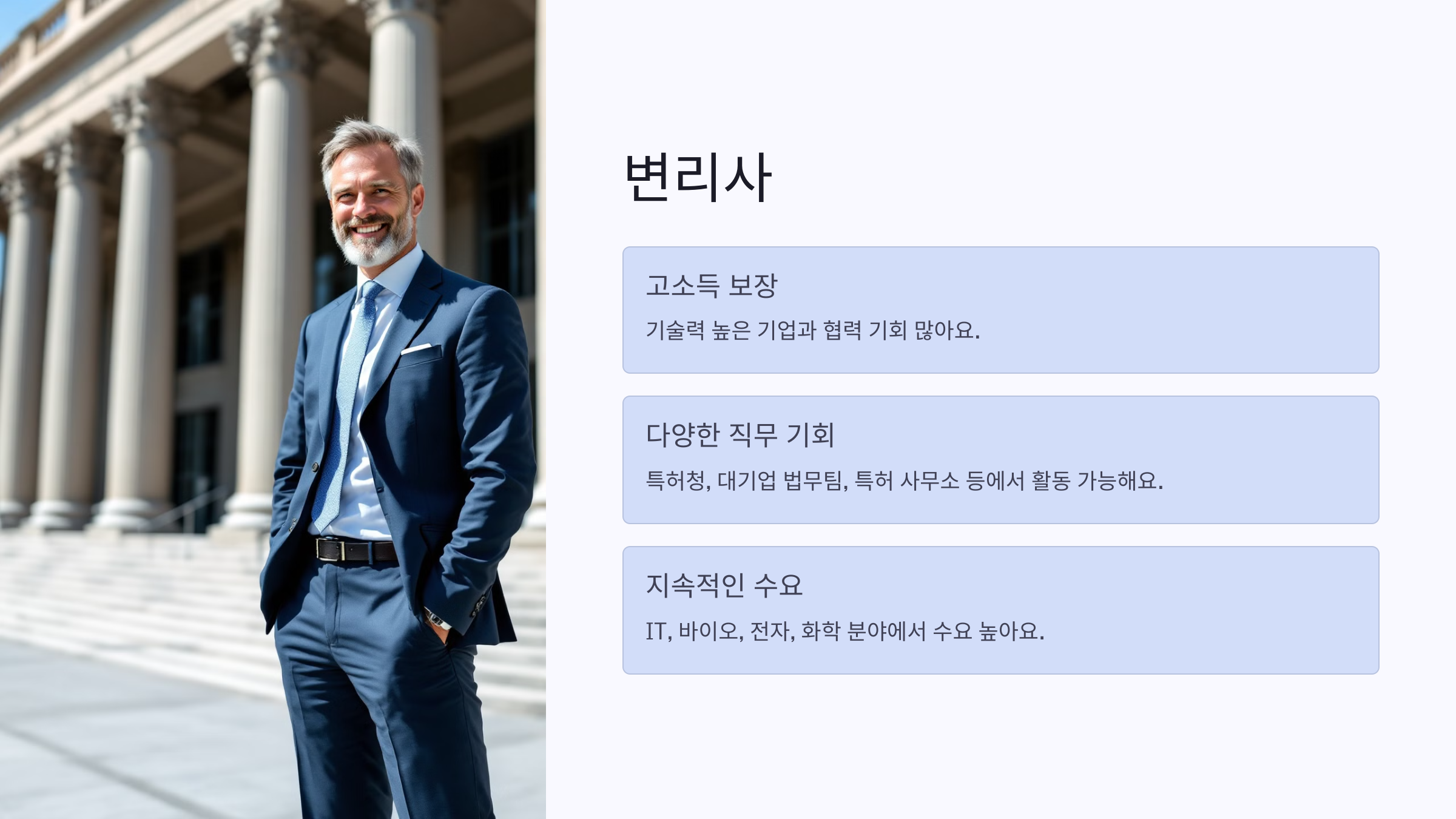 - 지속적인 수요: 기술 발전이 빠르게 일어나고 있는 시대적 흐름에 맞춰, 지식재산권의 중요성이 점점 커지고 있어요. 특히 IT, 바이오, 전자, 화학 분야에서 변리사의 수요가 높아지고 있어, 앞으로도 변리사는 꾸준히 고소득을 유지할 수 있는 직업이에요.