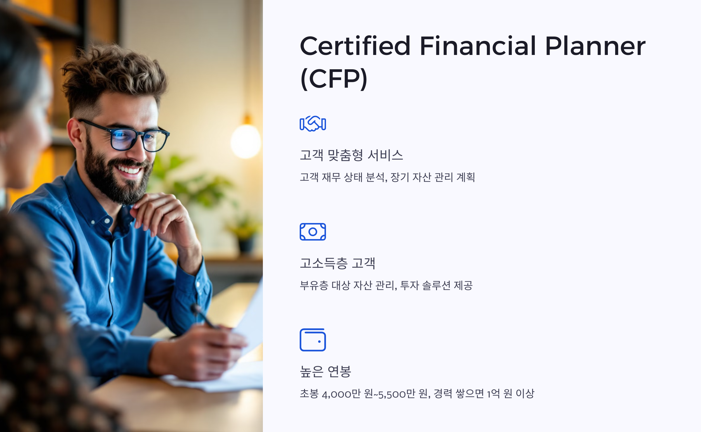 국제공인재무설계사(CFP)는 고객의 재무 상태를 분석하고, 맞춤형 금융 솔루션을 제공하는 전문가에요. 은행, 증권사, 보험사 등에서 일하며 고객의 자산 관리, 투자 계획, 세금 절감 전략 등을 수립해주는 역할을 해요. 특히 부유층을 대상으로 자산 관리 서비스를 제공하기 때문에, 고소득을 기대할 수 있는 직업 중 하나에요.