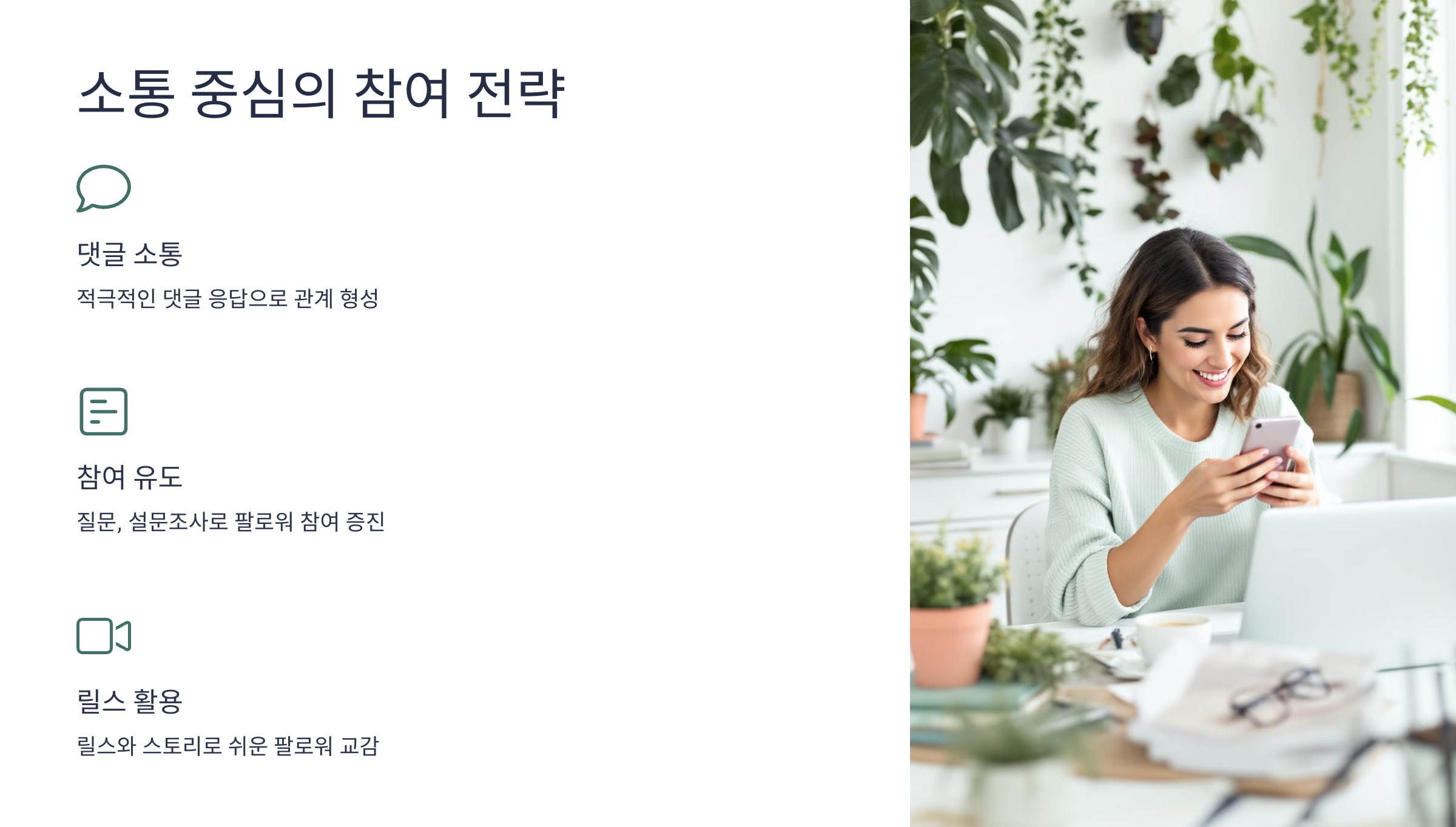 댓글, DM을 통해 팔로워와 적극적으로 소통하세요.