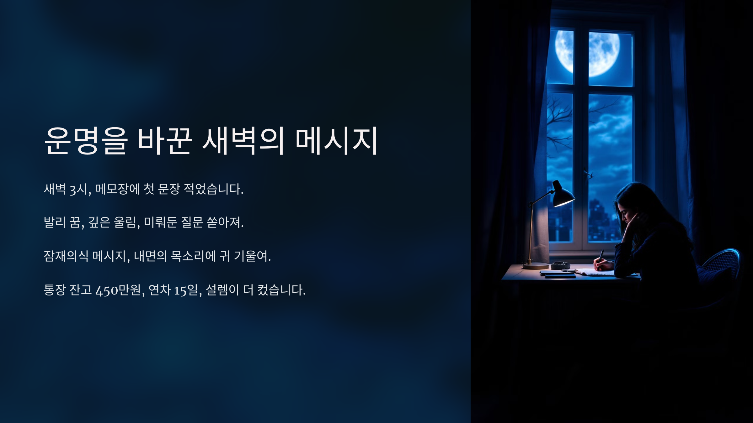 창밖으로 달빛이 스며드는 새벽 3시, 스마트폰을 켜고 메모장을 열었습니다. "지금 이 순간이 바로 시작이다." 떨리는 손으로 적은 첫 문장이었죠. 꿈에서 만난 발리의 풍경이 마음속에 깊은 울림을 주었고, 그동안 미뤄두었던 질문들이 물밀듯이 밀려왔습니다.