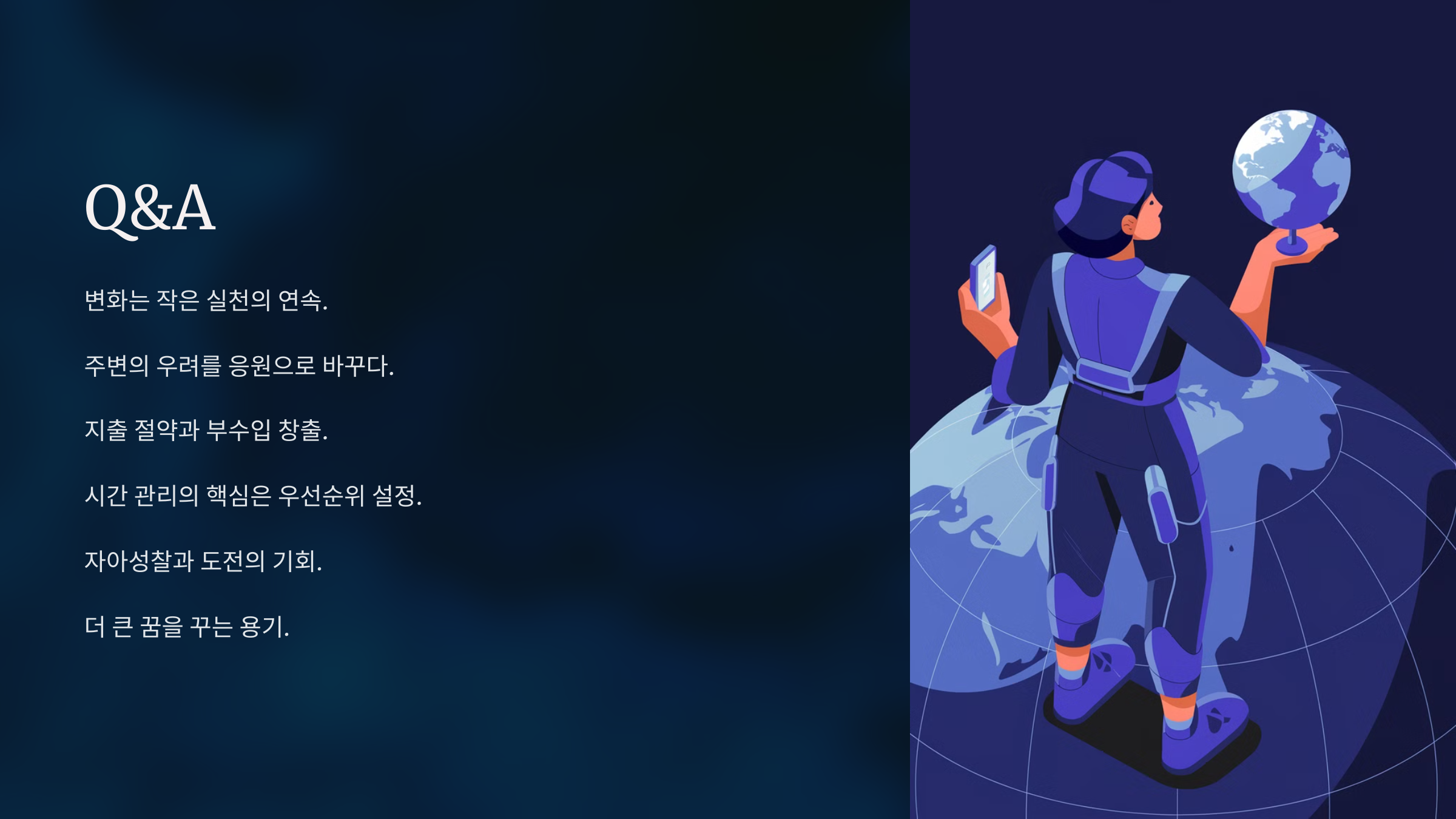 A: 변화는 거창한 결심이 아닌, 작은 실천의 연속이라는 점입니다. 매일의 작은 진보가 큰 변화를 만들어냈죠.