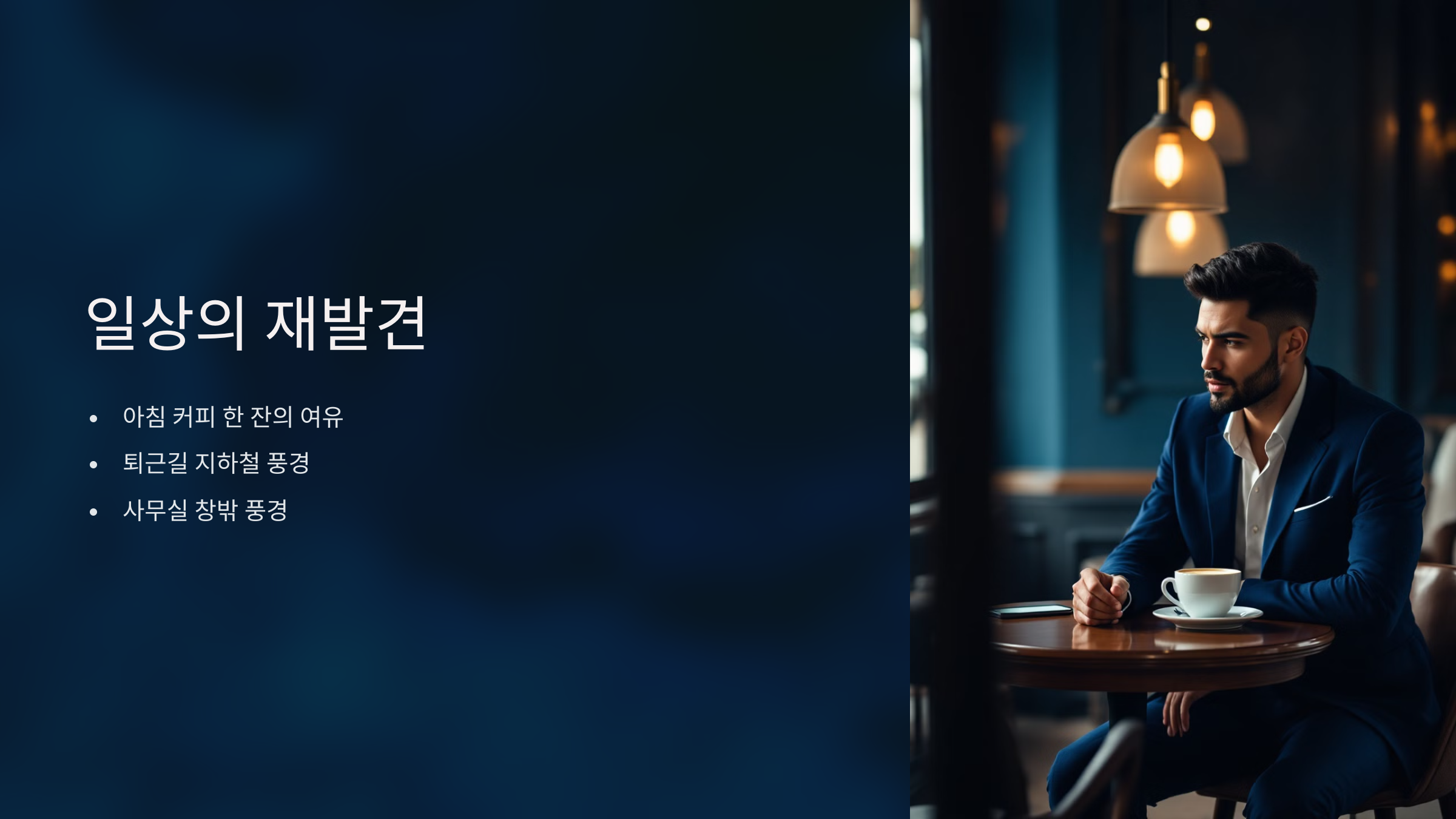 사무실 창밖 풍경도 달라보였습니다. 매일 보던 빌딩 숲이 마치 도시 협곡 같았고, 런치타임의 분주함은 작은 축제처럼 느껴졌죠. 평범한 일상이 특별한 순간들의 연속이 되었습니다.