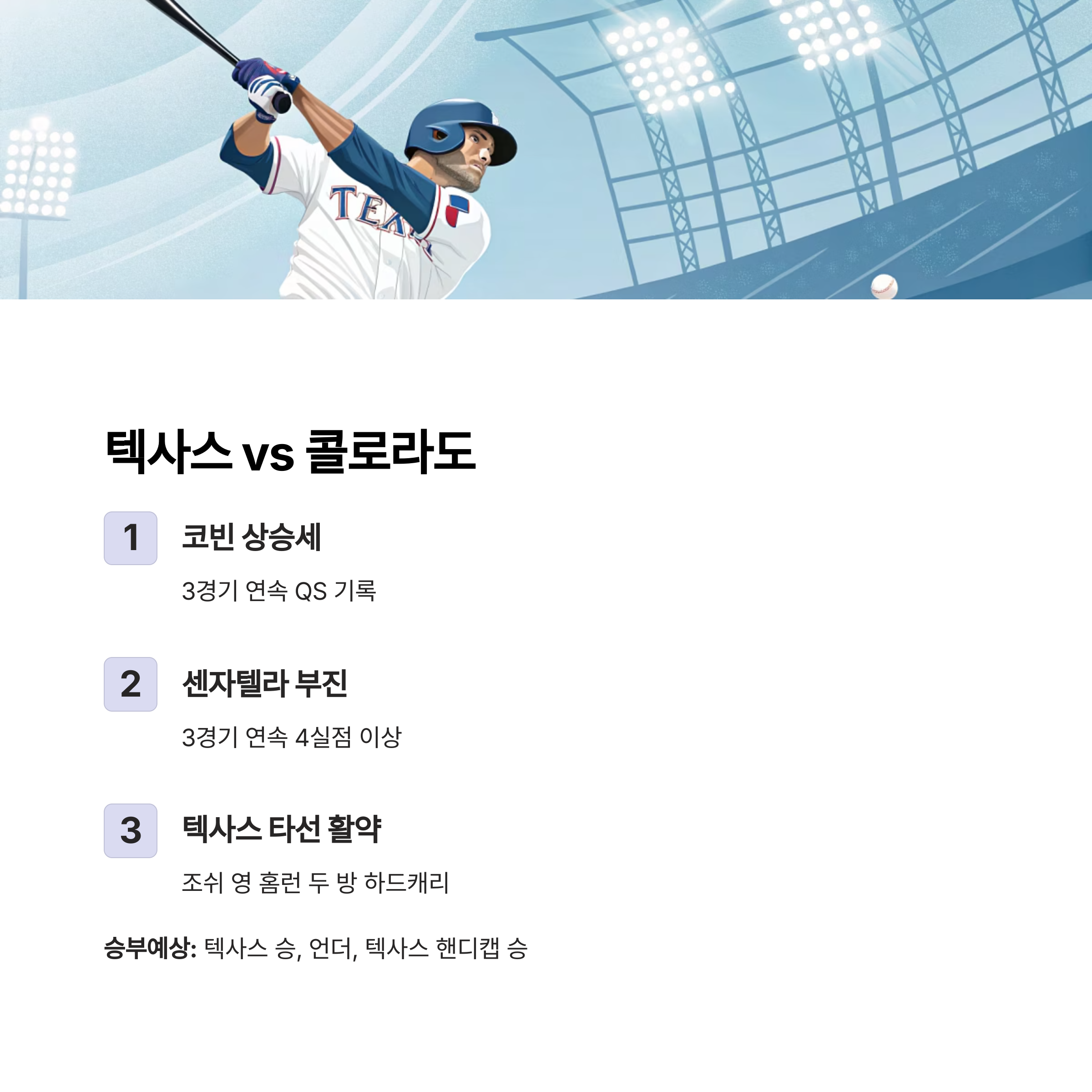 선발, 불펜, 타격 모두 우위에 있는 텍사스가 우세한 흐름을 만들 경기입니다.