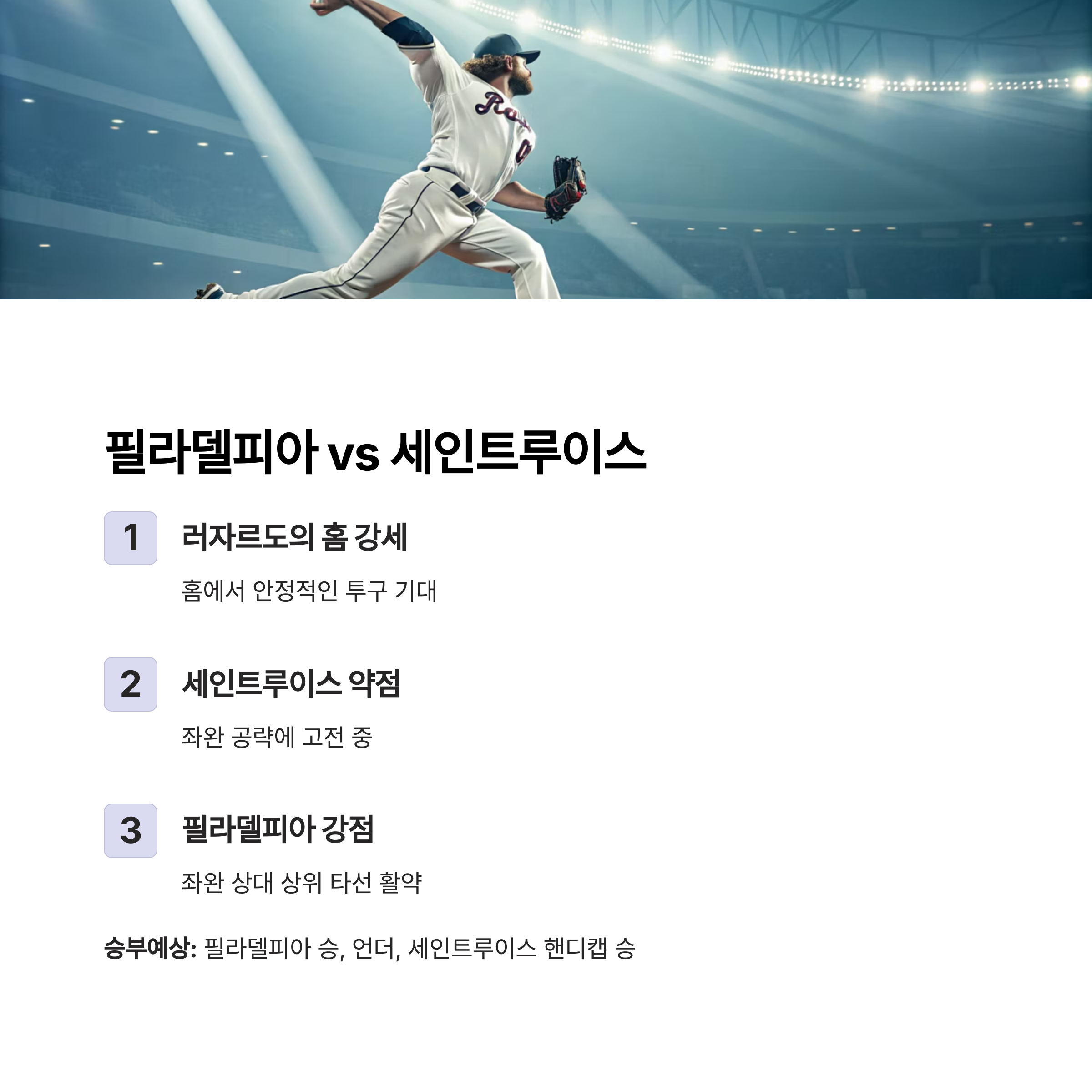 최근 세인트루이스 타선이 좌완 공략에서 고전하는 흐름이 지속되고 있어, 6이닝 2실점 내외의 투구는 충분히 기대해볼 수 있습니다.