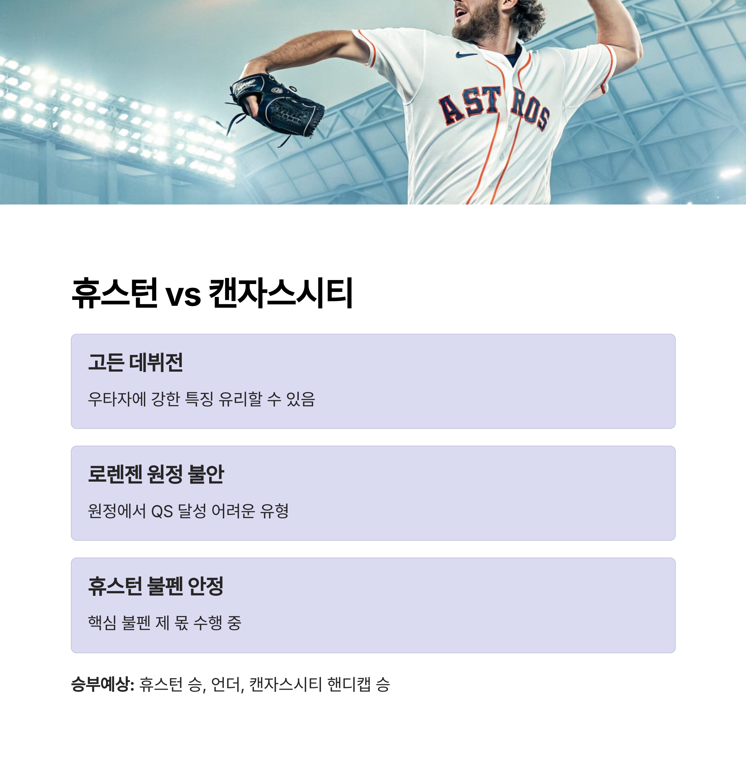 변화구와 제구 중심의 투구 스타일로, 우타자에게 강하다는 특징이 켄자스시티 상대로 유리할 수 있는 요인입니다.