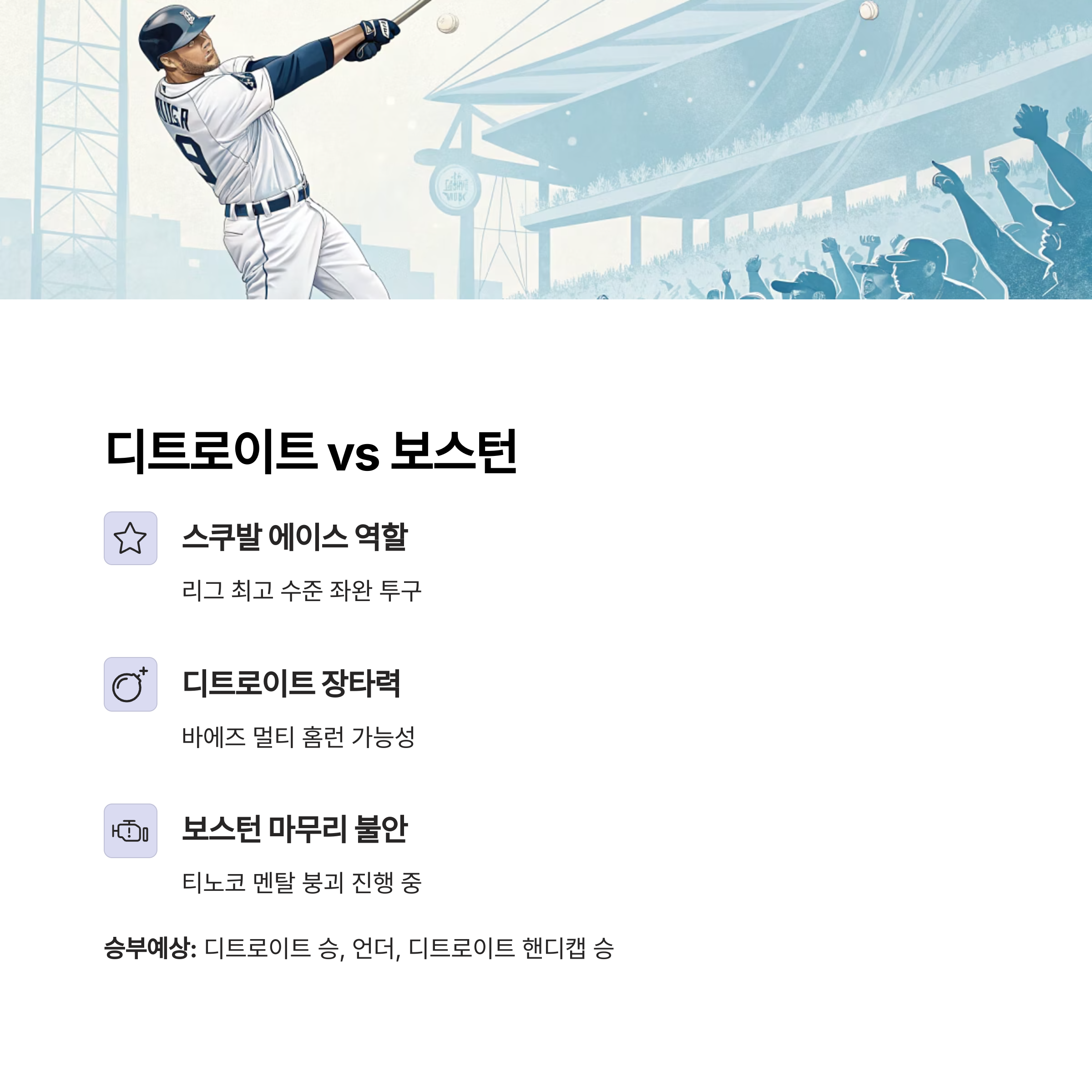 디트로이트는 홈에서 좌완 투수에 강한 타자들이 포진해 있고, 바에즈의 멀티 홈런으로 이어진 강력한 한 방은 경기를 뒤집는 변수로 작용할 수 있습니다.