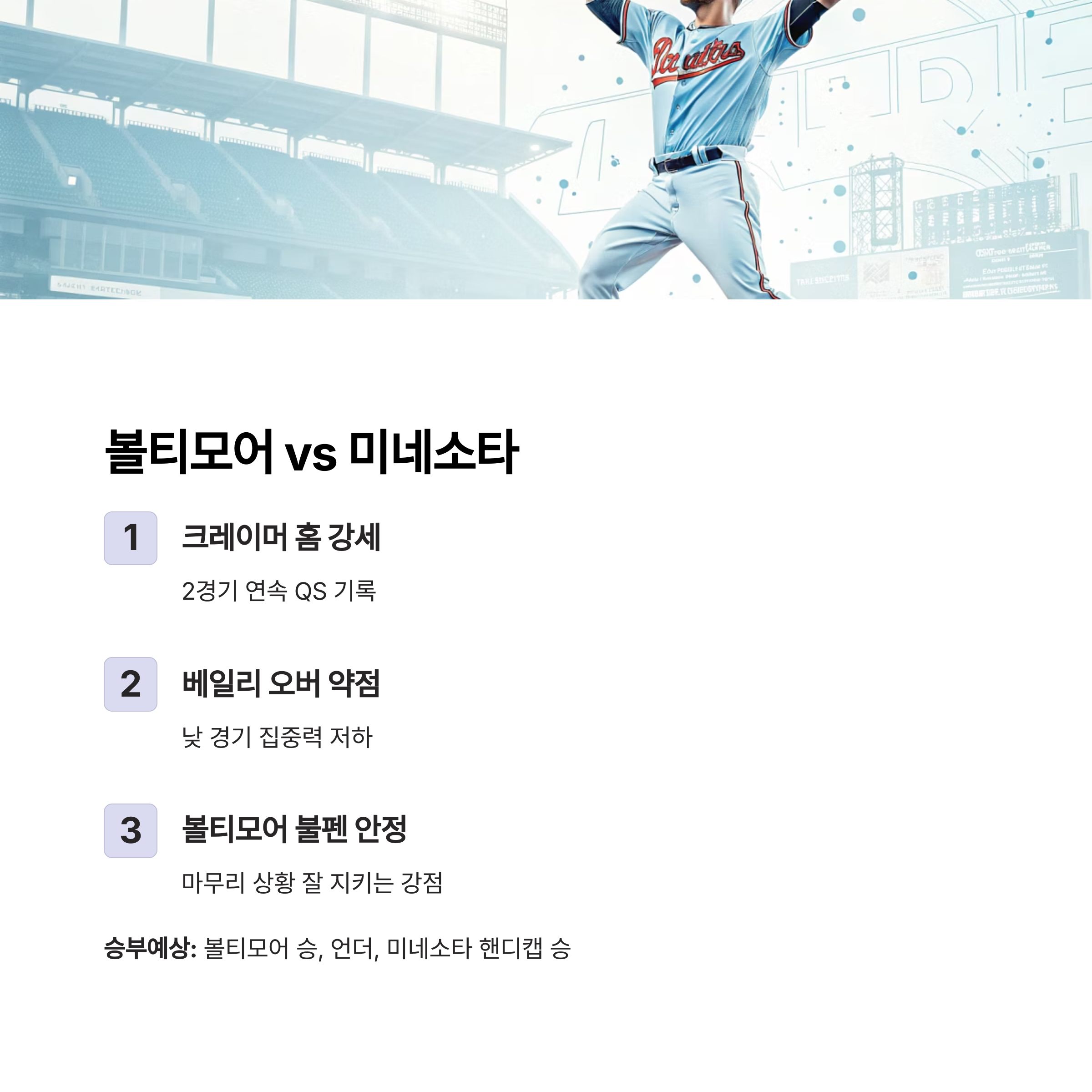 홈 강세 크레이머, 낮기 약한 오버, 그리고 집중력이 좋은 볼티모어 불펜의 조합이라면 홈팀의 승리가 유력해 보입니다.