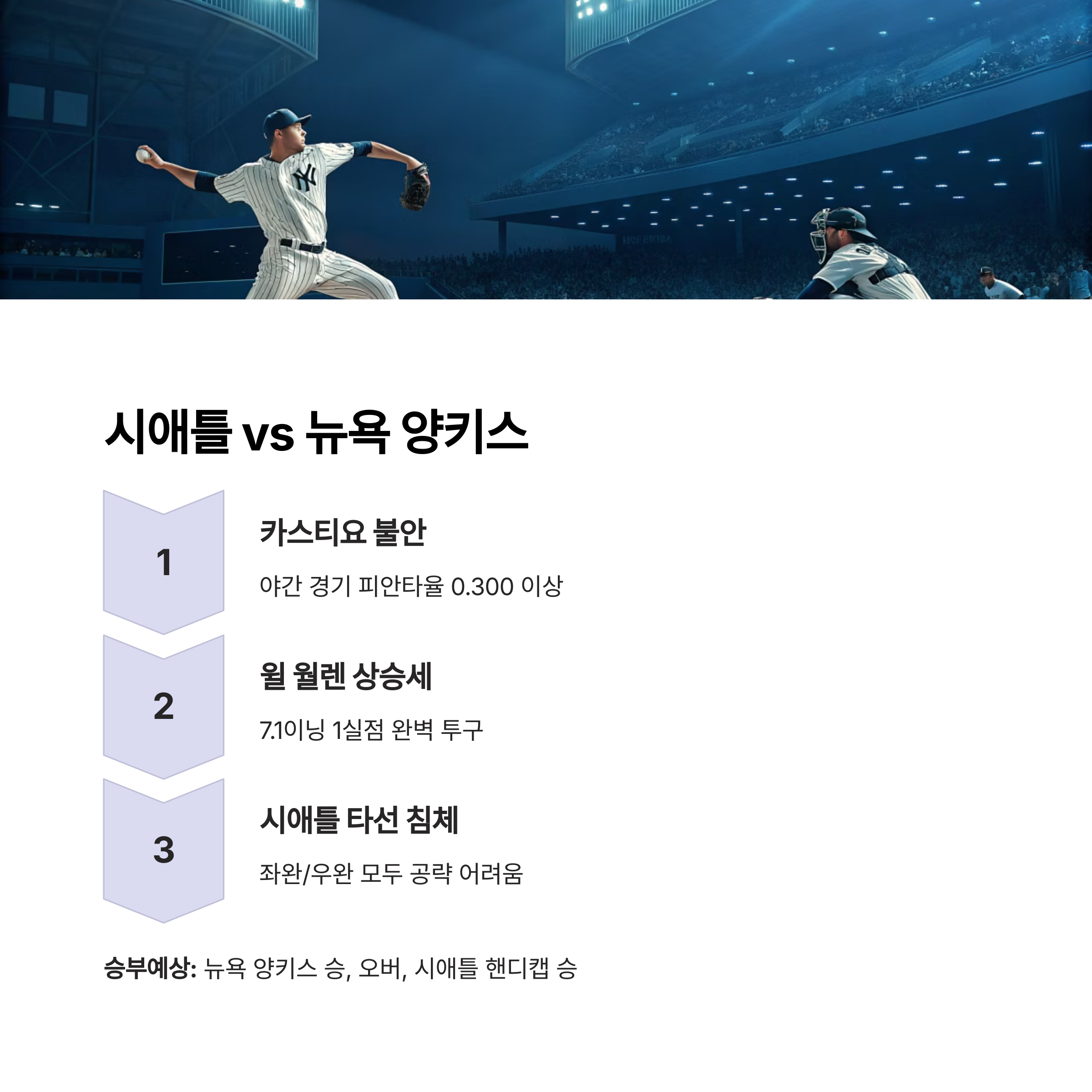 최근 홈에서 5이닝 5실점으로 흔들렸고, 상대가 타선 집중력이 뛰어난 뉴욕 양키스라는 점에서 불안 요소가 큽니다.