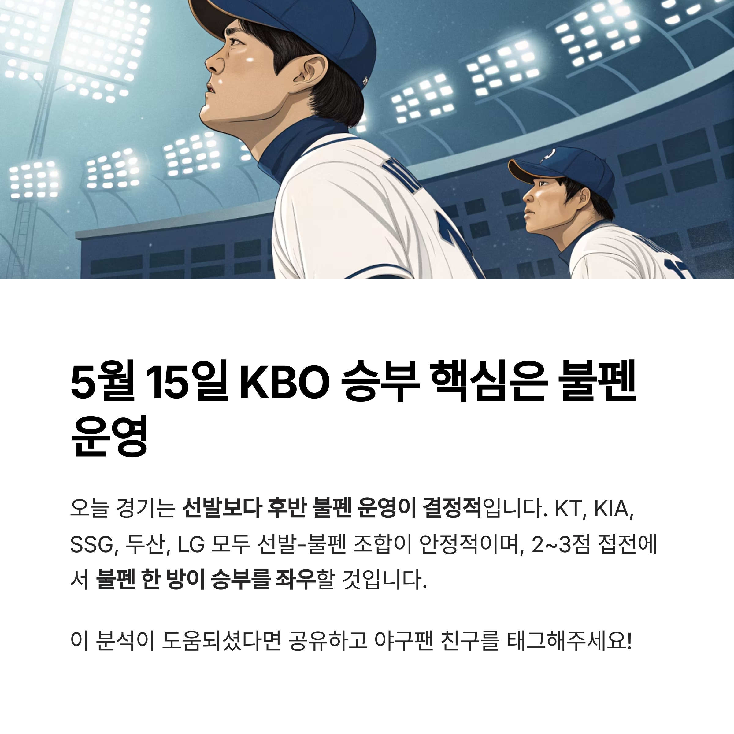 5월 15일 KBO 5경기의 핵심은 선발 싸움보다 후반 불펜 운영에서 결정적인 차이가 날 가능성입니다.
