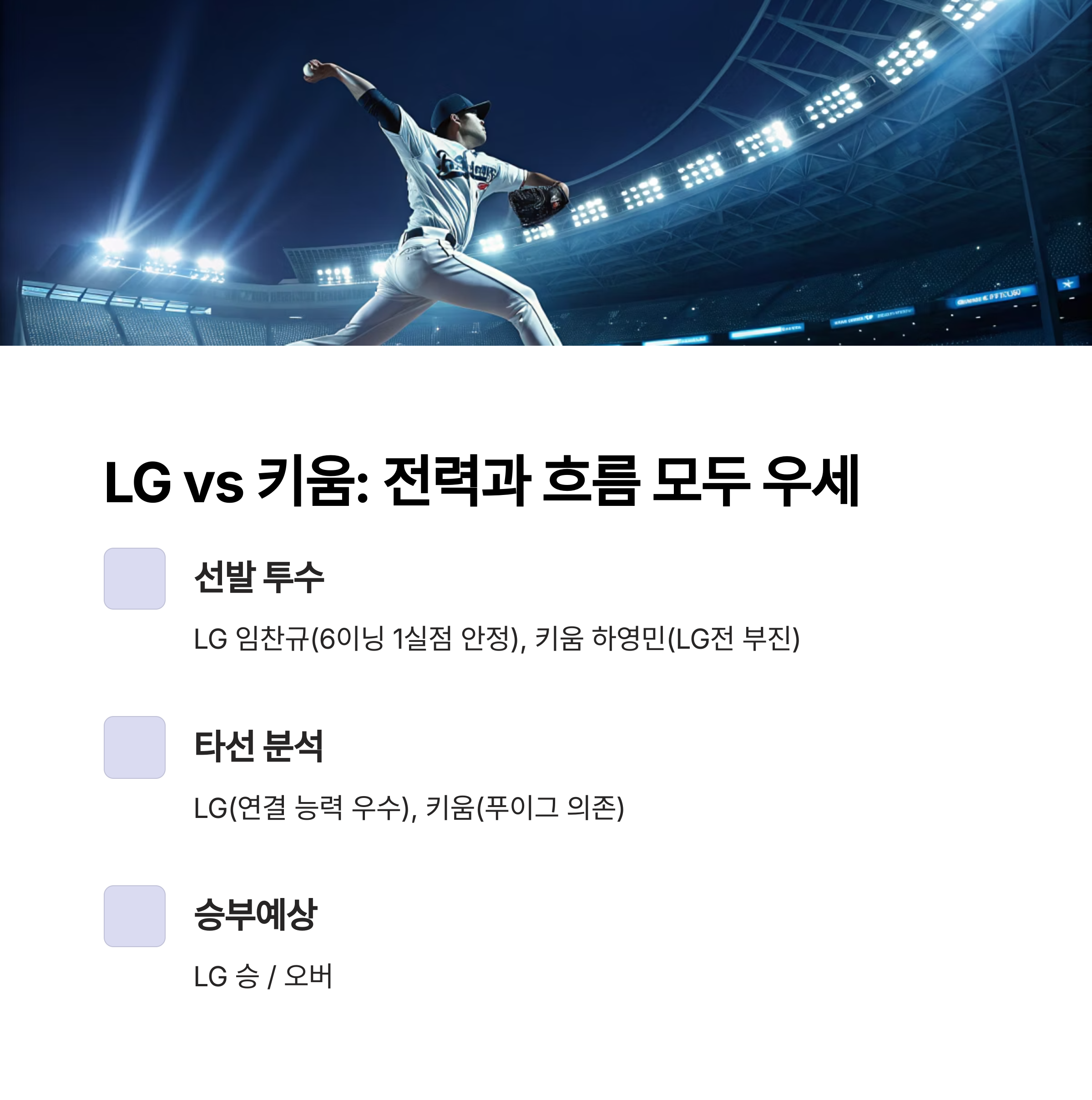 전력과 흐름 모두에서 LG가 주도권을 잡고 경기를 이끌어갈 가능성이 높습니다.