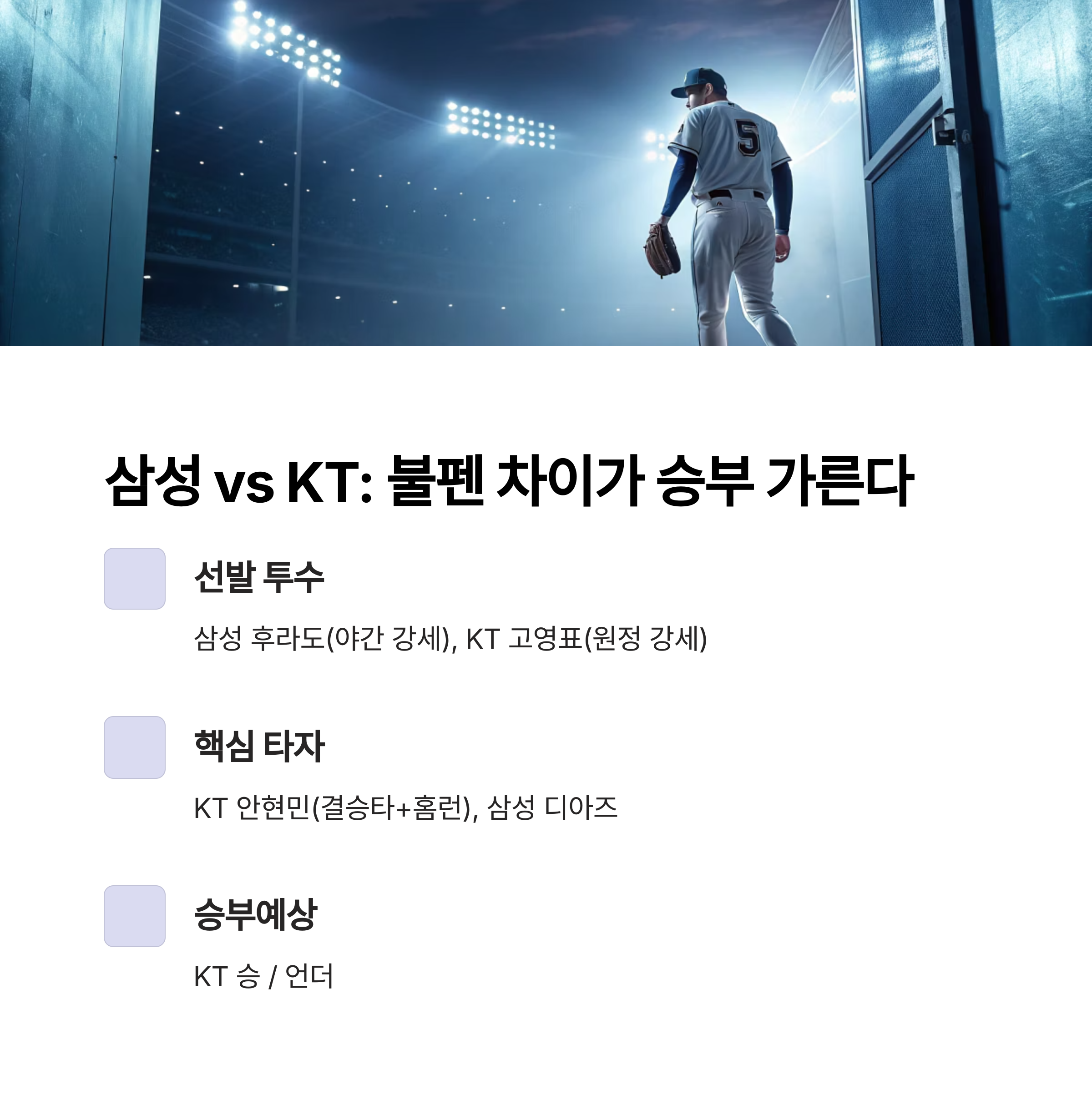 불펜 싸움에선 KT가 손동현-주권-김재윤 중심의 신뢰할 수 있는 승리조 운영이 강점입니다.