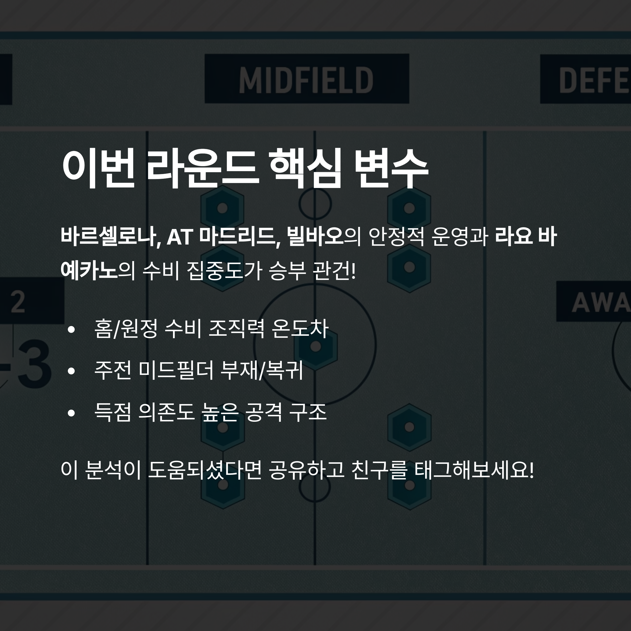 상위권 팀들의 동기 부여 여부, 하위권 팀들의 홈 집중력, 그리고 주전 이탈에 따른 수비 변화가 승패를 좌우할 결정적 변수로 작용할 전망입니다.