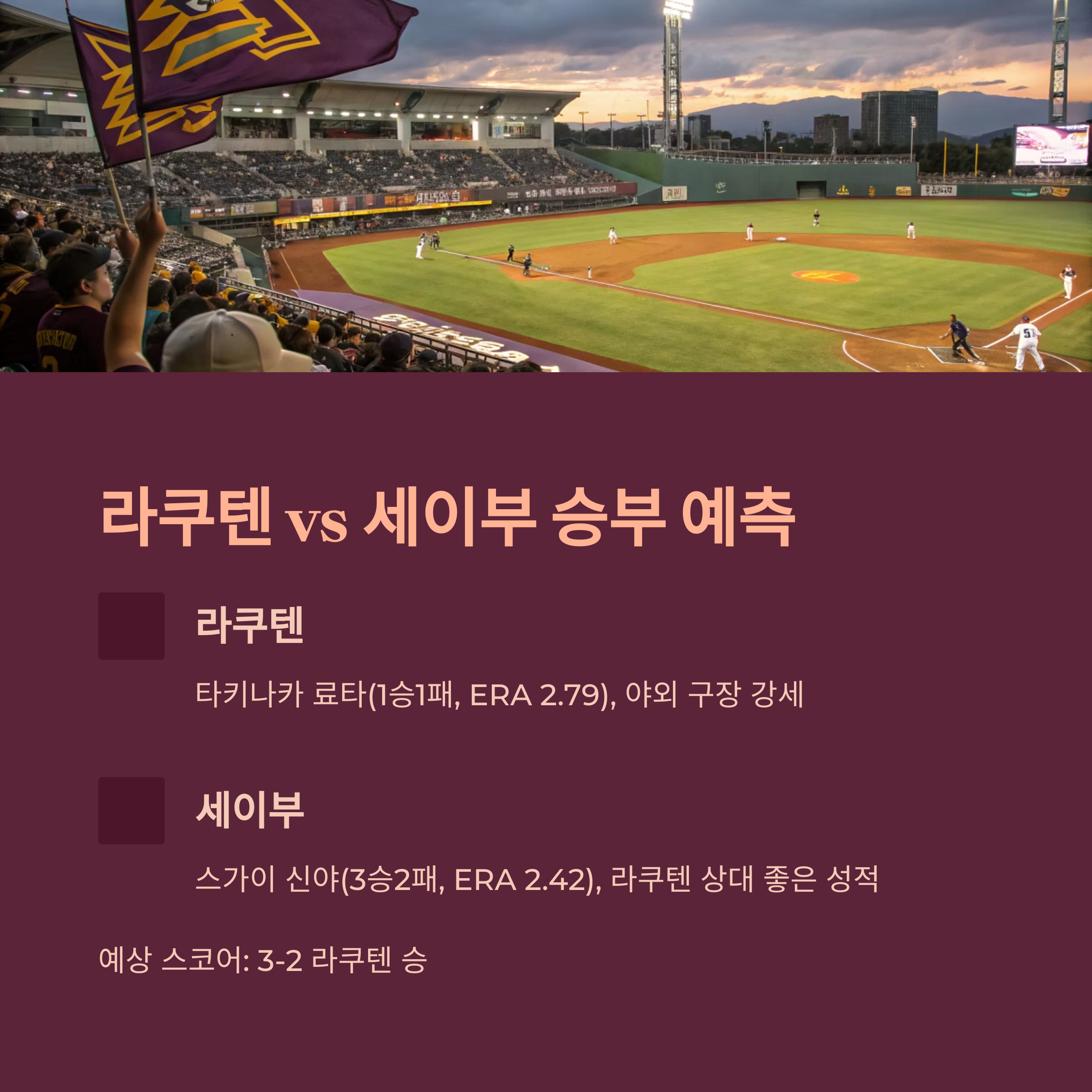 라쿠텐의 홈 강세와 세이부의 화요일 득점력 부진을 고려하면 라쿠텐이 유리할 것 같아요.