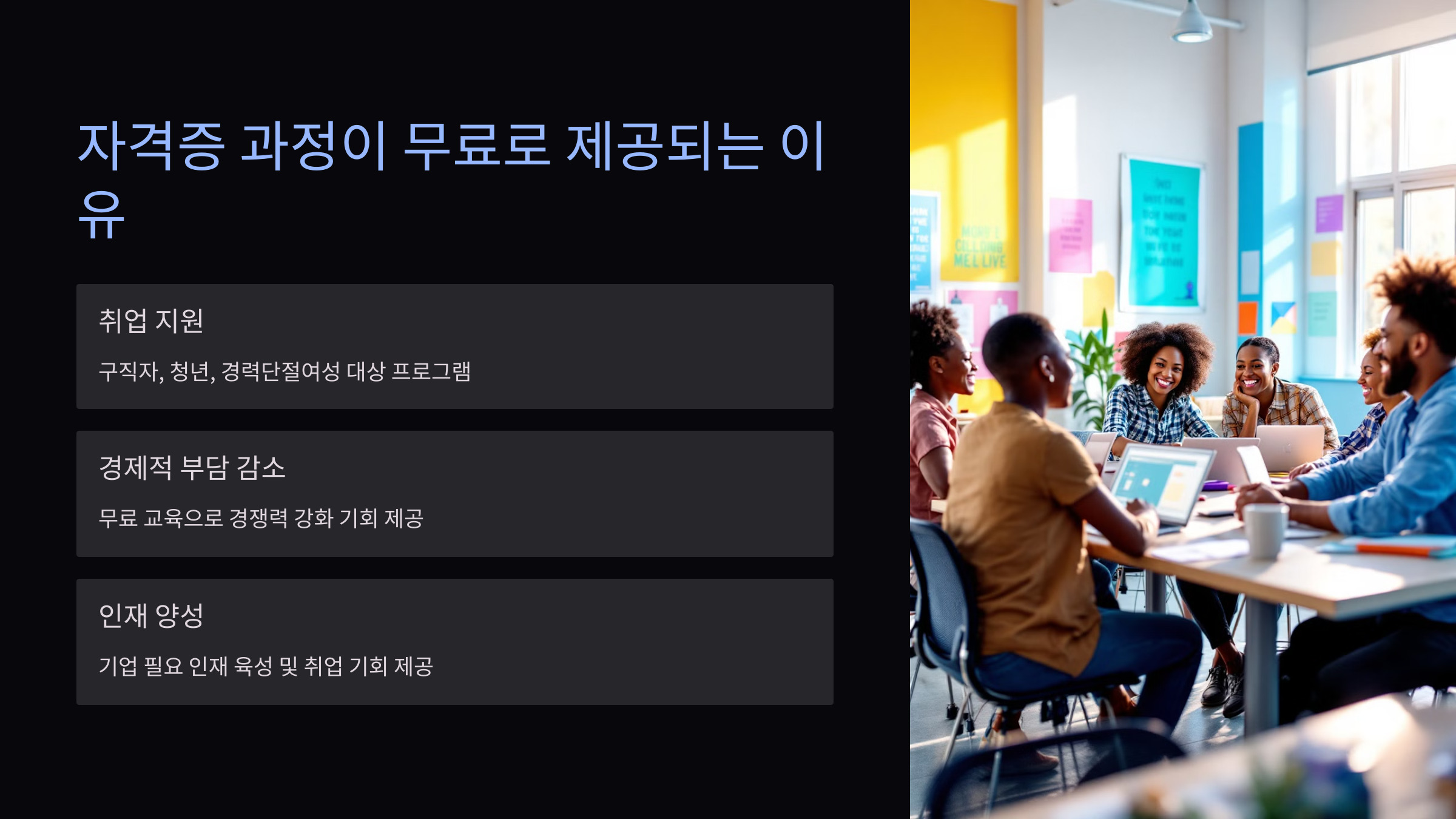 대부분의 무료 자격증 과정은 국가나 공공기관에서 취업 지원 목적으로 제공해요. 이는 구직자, 청년, 경력 단절 여성 등을 대상으로 하는 프로그램으로, 이들에게 직무 교육을 제공하여 경제적 부담 없이 경쟁력을 강화하는 것을 목표로 합니다. 예를 들어 한국고용정보원, 한국생산성본부 같은 공공기관에서 무료로 자격증 과정에 지원할 수 있어요.