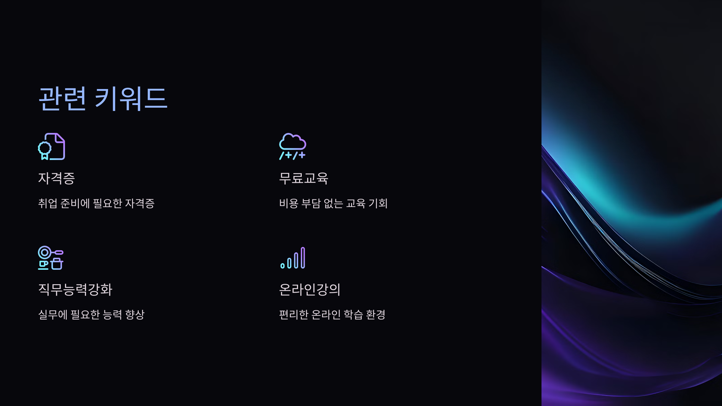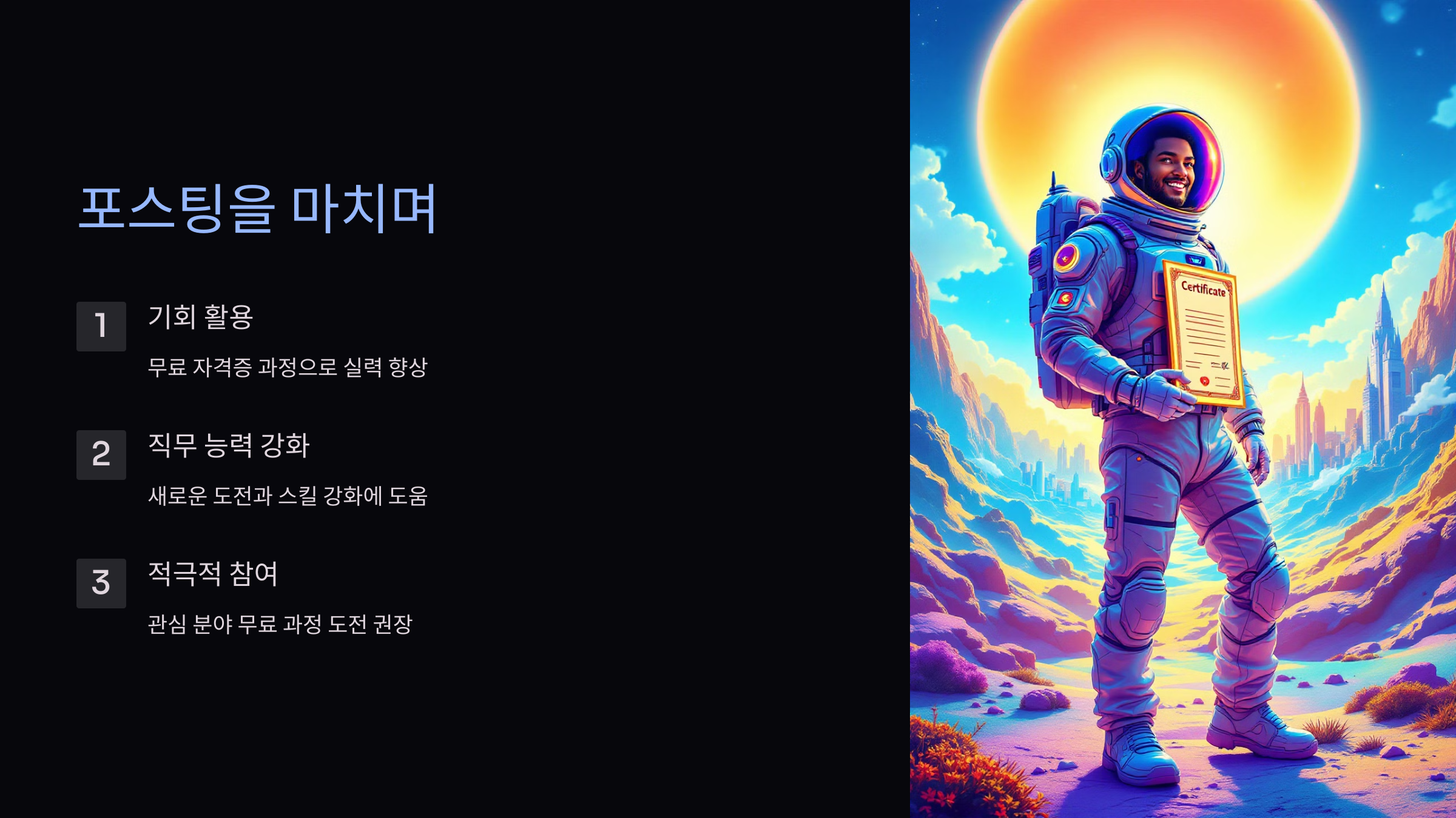 무료 자격증 과정은 실력을 쌓고 직무 능력을 강화할 수 있는 절호의 기회예요. 무료로 제공되는 과정이라도 유용한 자격증이 많으니 적극적으로 활용해 보세요. 새로운 직무에 도전하거나 스킬을 강화하는 데 이 무료 과정들이 큰 도움이 될 거예요. 관심 있는 분야가 있다면 오늘부터 도전해 보세요!