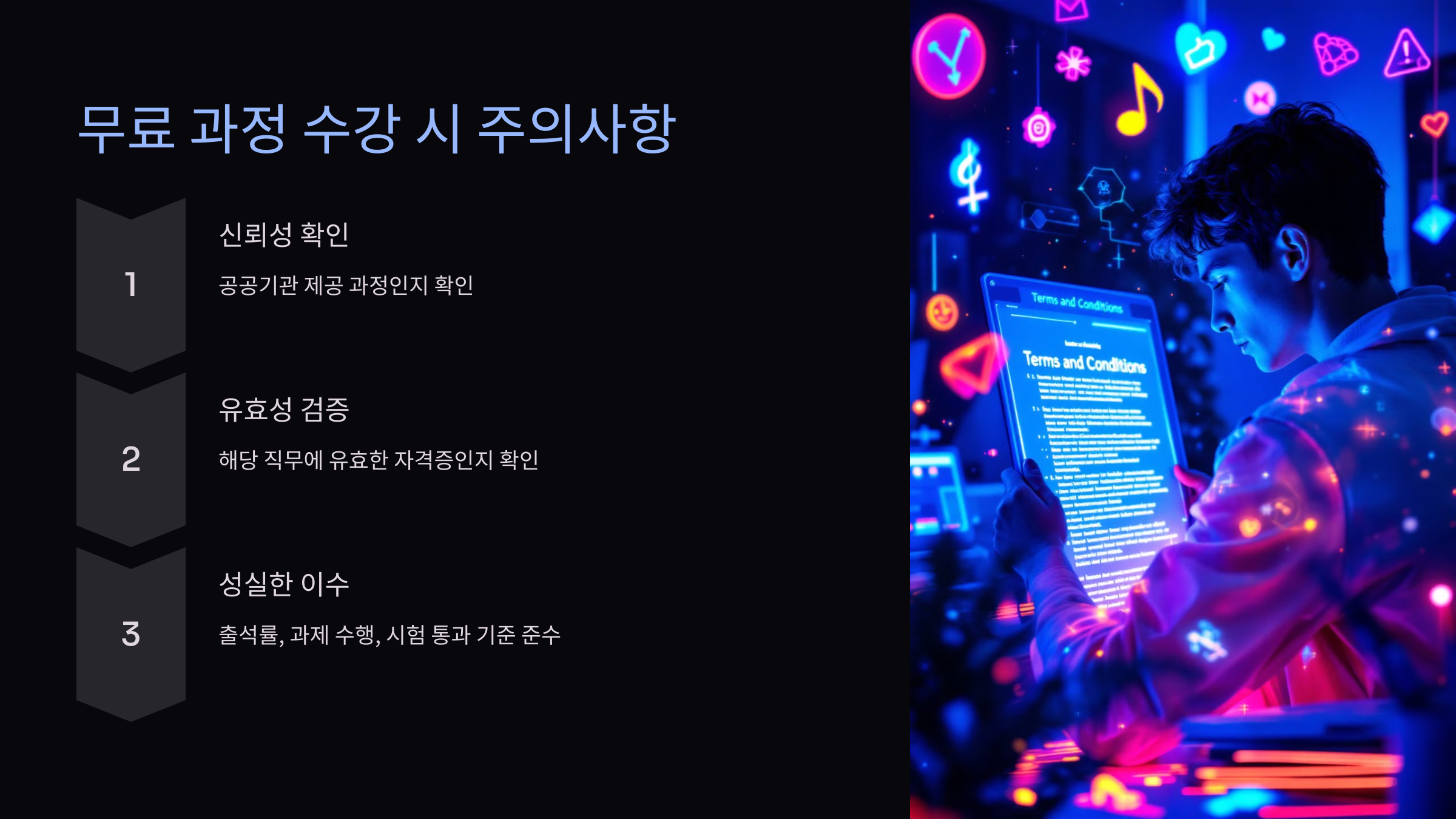 무료 과정이라고 해서 모두 신뢰할 수 있는 것은 아니에요. 특히 인터넷에서 제공되는 무료 자격증 과정 중에는 공식 인증되지 않은 곳도 있으니 주의해야 해요. 공공기관에서 제공하는 과정인지 확인하고, 자격증이 해당 직무에 유효한지, 그리고 기업들이 실제로 인정하는 자격증인지 미리 알아보는 것이 좋아요.