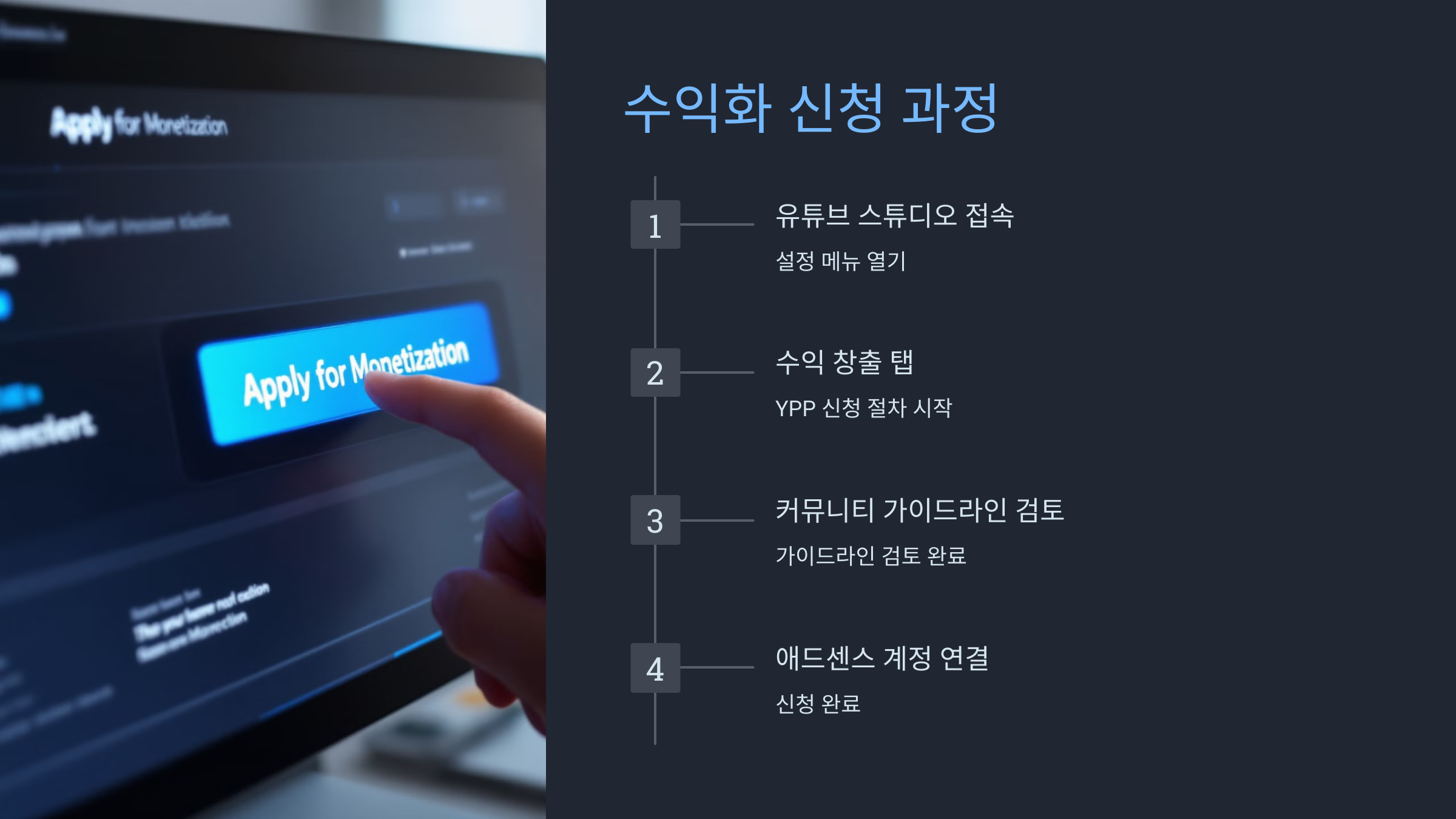 수익화를 신청하려면 유튜브 스튜디오에서 간단한 절차를 거쳐야 합니다.