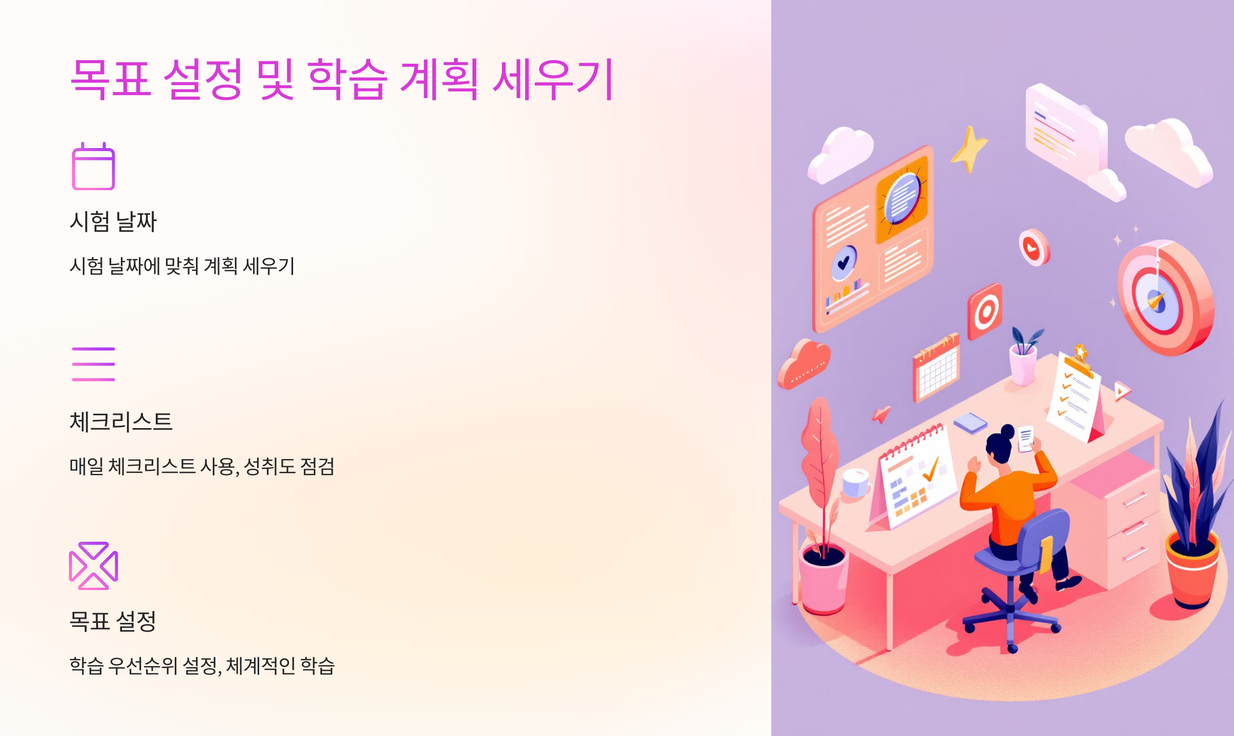 자격증 공부를 시작할 때 가장 중요한 것은 명확한 목표 설정과 구체적인 학습 계획을 세우는 거예요. 공부량이 많을 때는 목표가 불명확하면 쉽게 지칠 수 있죠. 시험 날짜에 맞춰 주요 내용을 나눠서 계획을 세우고, 하루에 얼마나 공부할지 구체적으로 설정하는 것이 중요합니다.