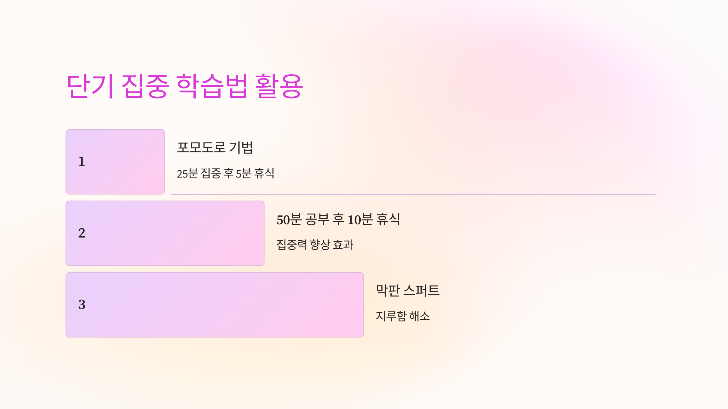 이러한 방법은 짧은 시간 동안 학습에 온전히 집중할 수 있도록 돕기 때문에, 집중력이 떨어지기 쉬운 분들에게 특히 유용해요. 시험 전 막판 스퍼트가 필요할 때, 또는 지루함을 덜고 싶은 분들에게 추천드려요.